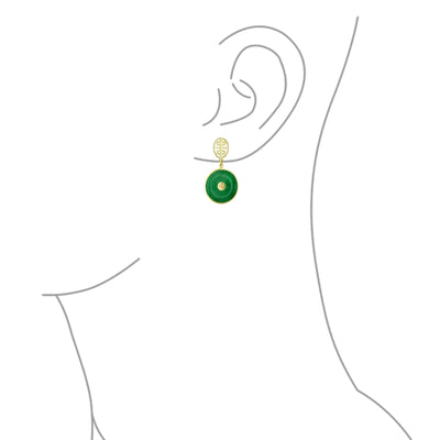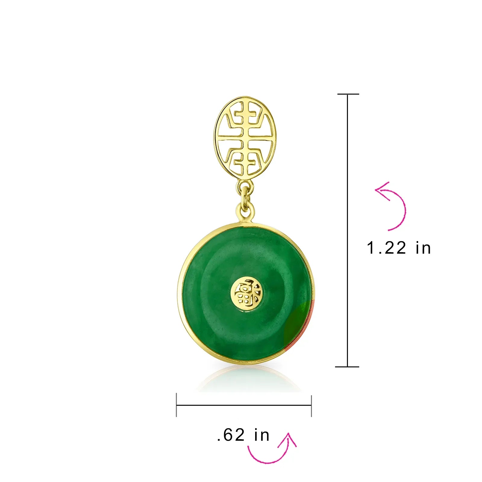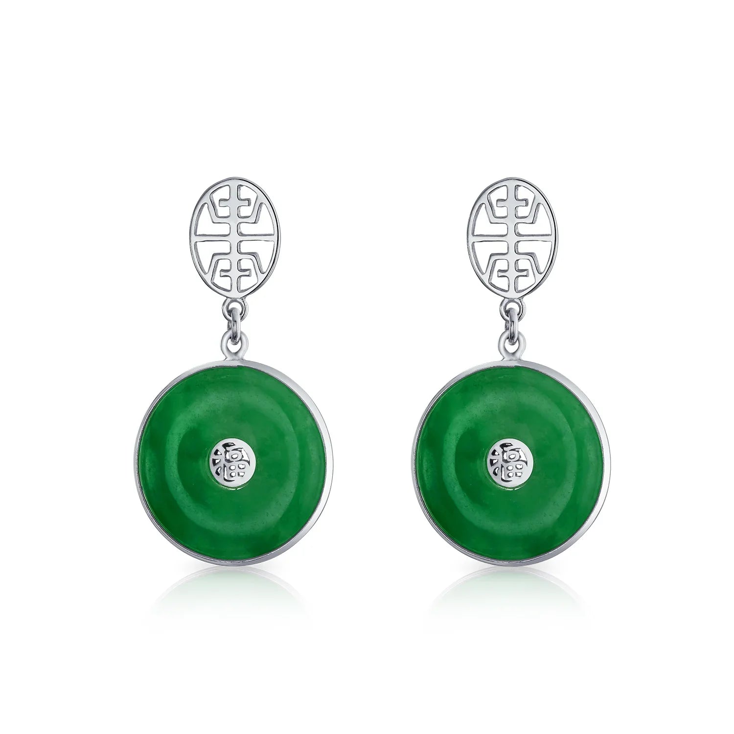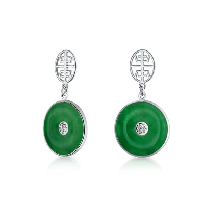 - Enhance your style with these circle disc dangle earrings featuring Chinese symbols for protection and prosperity. Jade, revered for centuries as a symbol of good luck, ensures you wear them in good health.