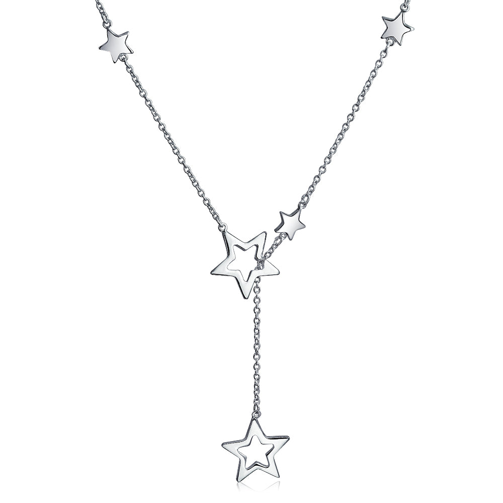 - Elevate your style with this stunning open star lariat necklace. Crafted from .925 Sterling Silver with rhodium plating for lasting shine. Features seven mini stars and two larger open stars on a 16-inch adjustable chain. Complete with a secure lobster claw clasp. Pair with matching star earrings for a glamorous, red carpet look.