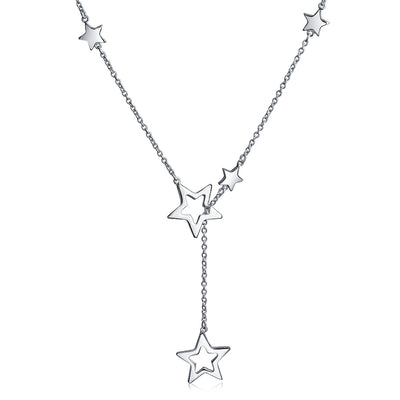 - Celestial Charm: Elevate your style with the cosmic joy of the Lariat necklace. This modern open star necklace features a patriotic, five-point star motif in high polished sterling silver. The alternating station style cutout stars and delicate chain add a touch of star power to every outfit. Perfect for those who love celestial galactic style, this necklace is a must-have addition to any jewelry collection.