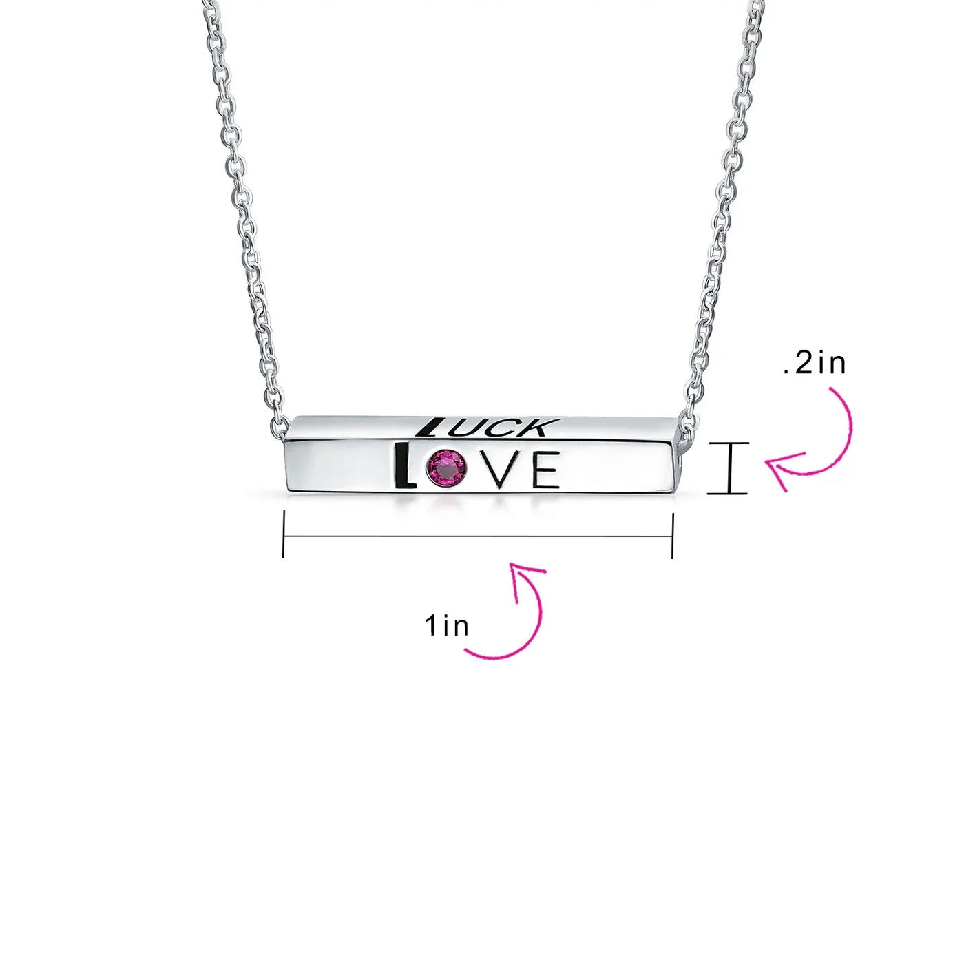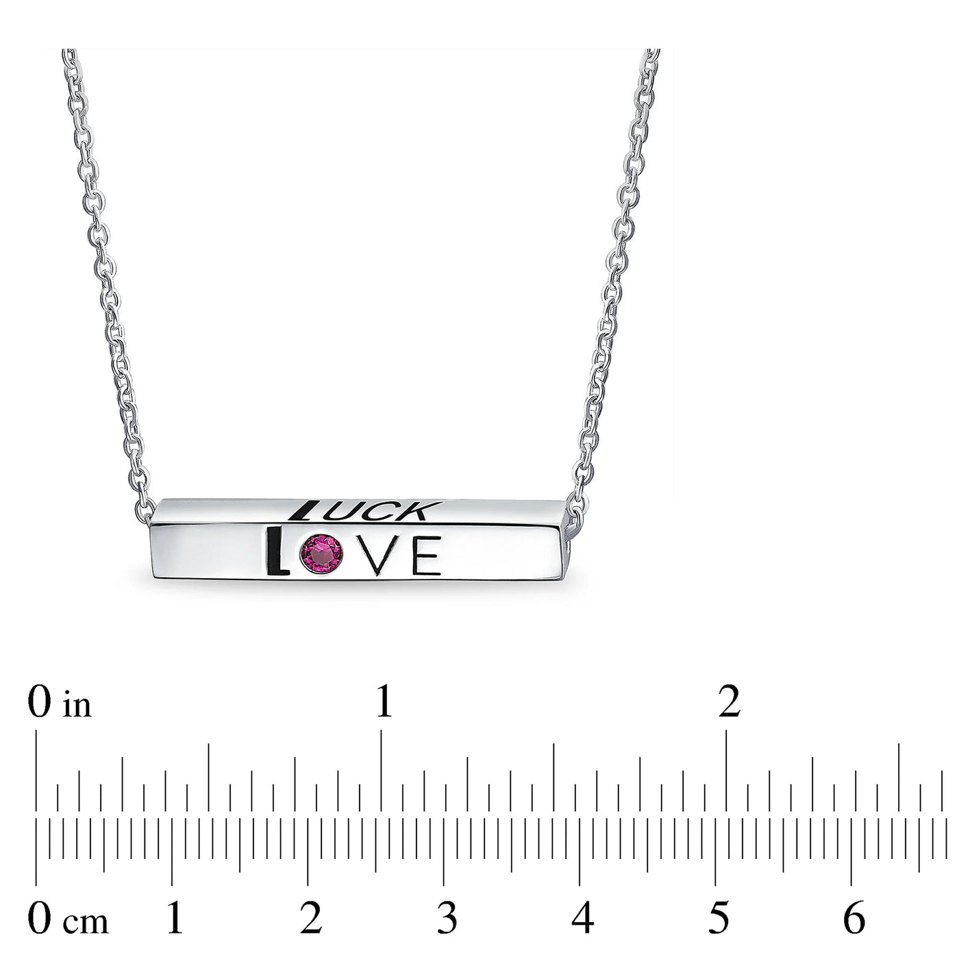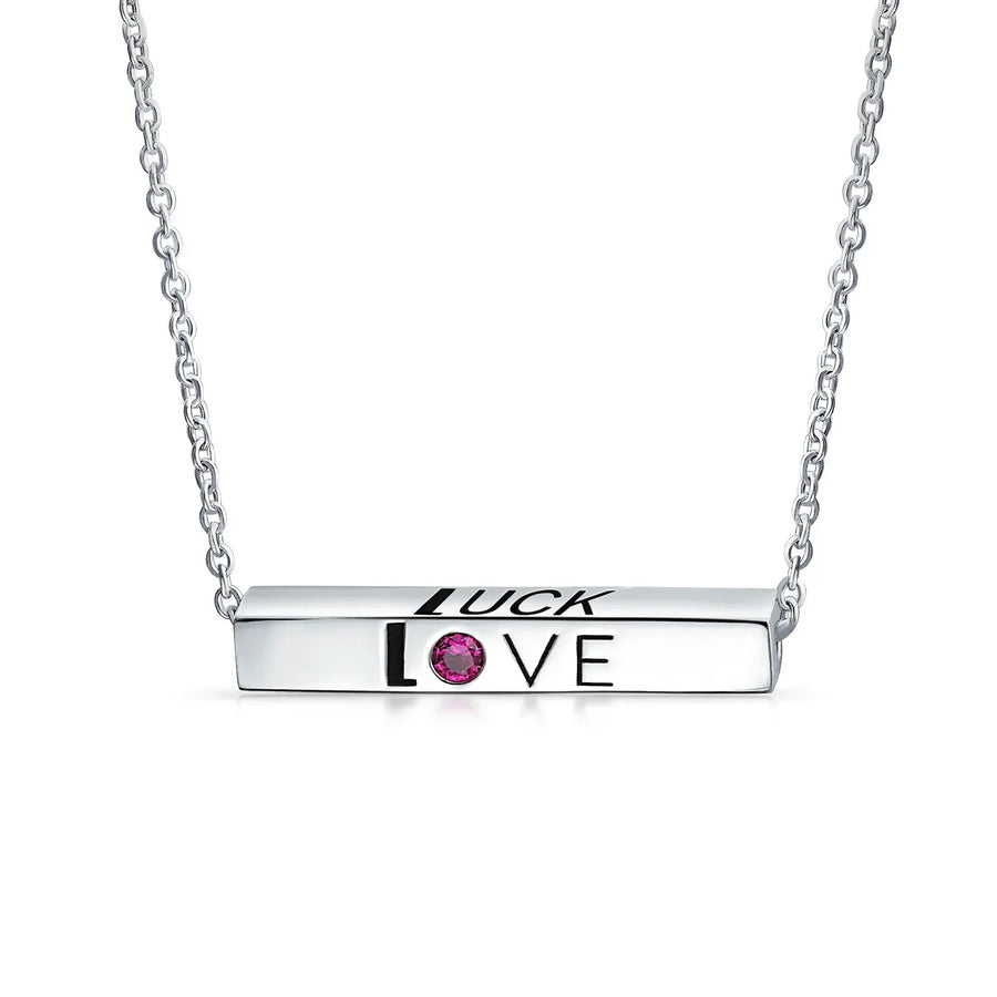 - This stunning, contemporary 3D bar pendant necklace celebrates AYLLU's ideals: Love, Luck, Unity. Ruby crystal accent on "Love." Handcrafted gift box included.