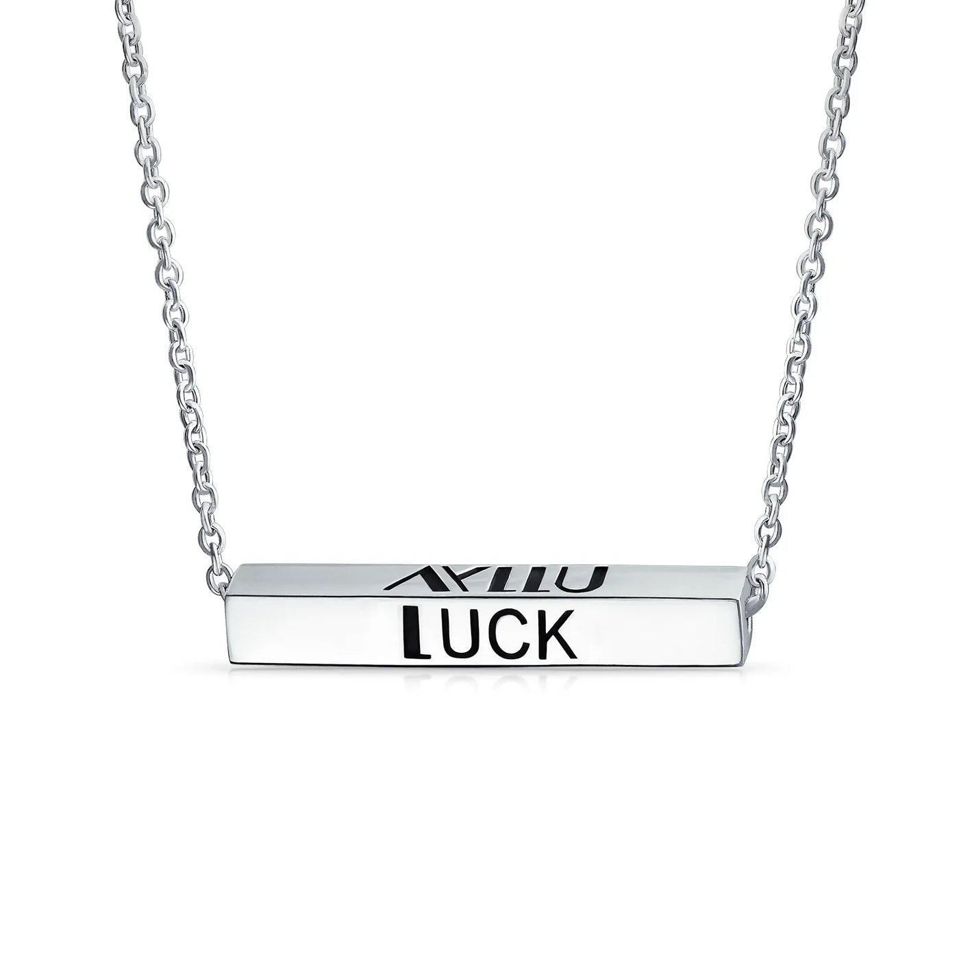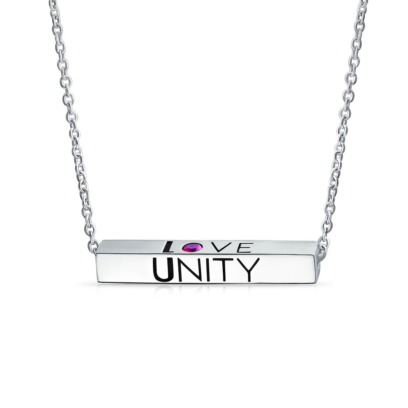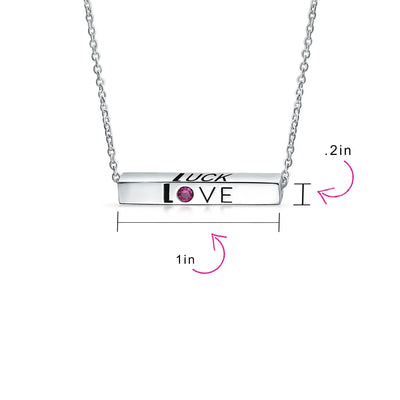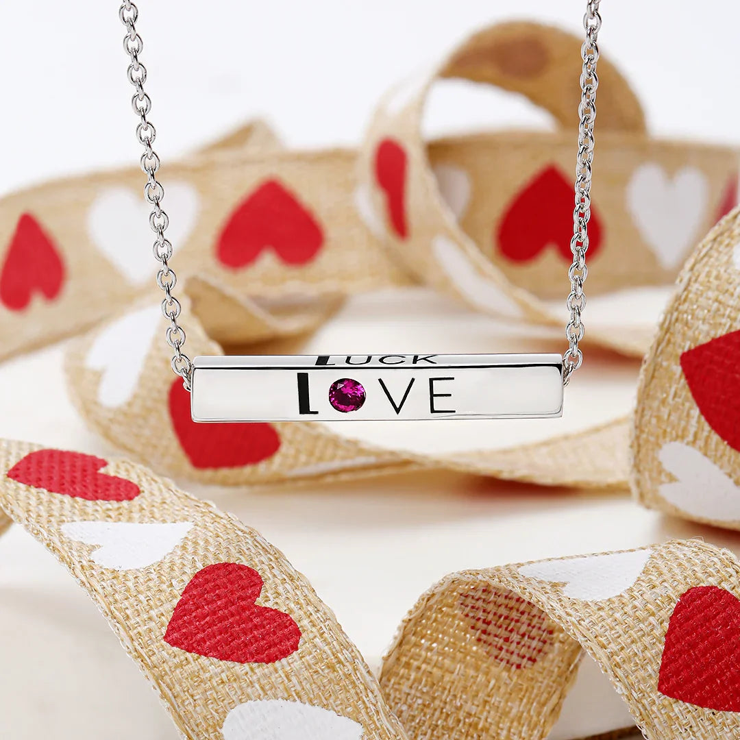 - This stunning, contemporary 3D bar pendant necklace celebrates AYLLU's ideals: Love, Luck, Unity. Ruby crystal accent on "Love." Handcrafted gift box included.