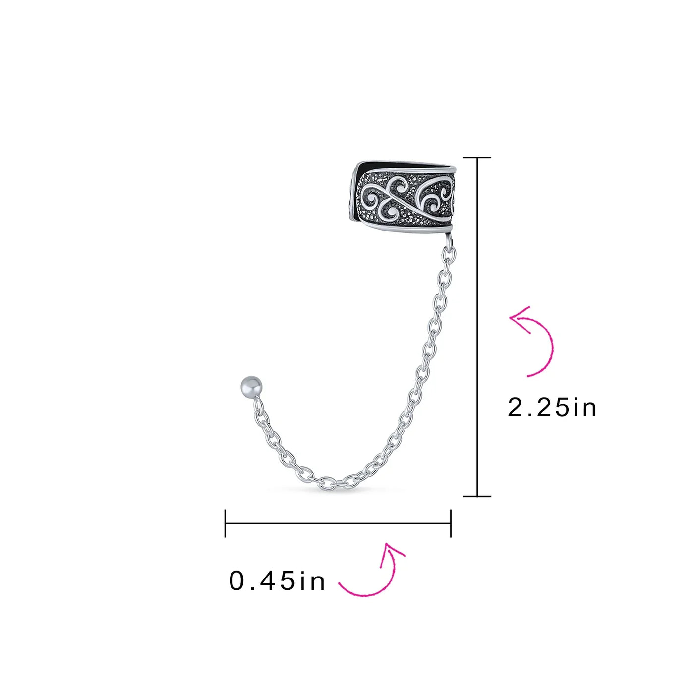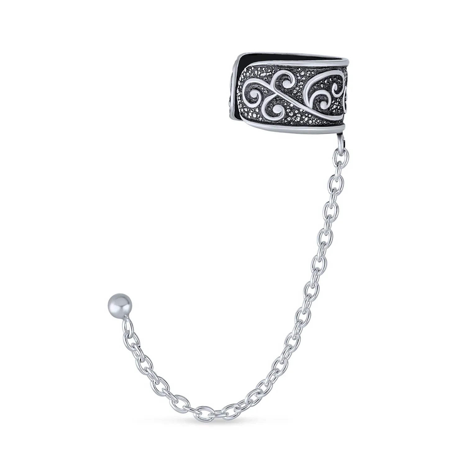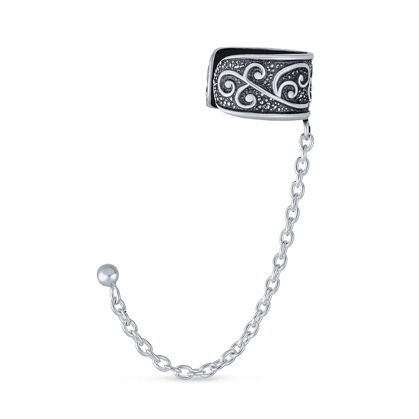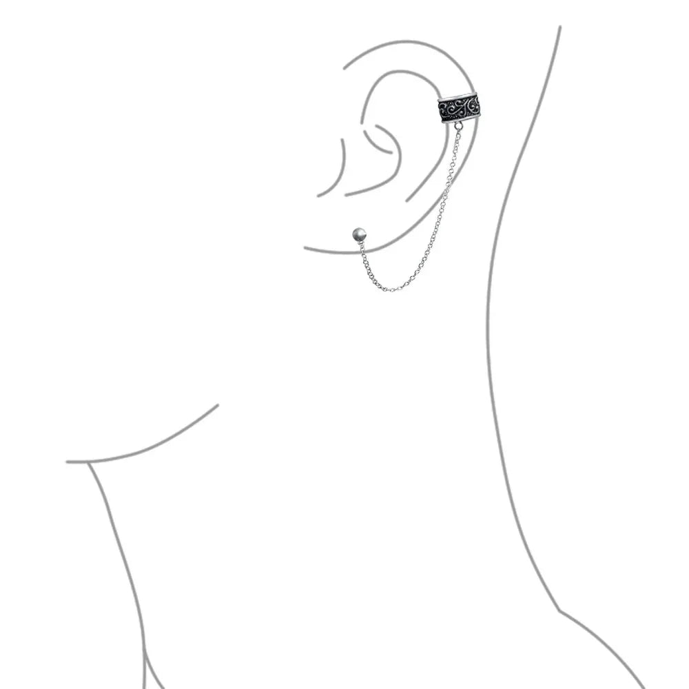- Enhance your style with a Celtic-inspired, swirling design in this chic sterling silver ear cuff earring, featuring a delicate chain connecting to a stud earring.