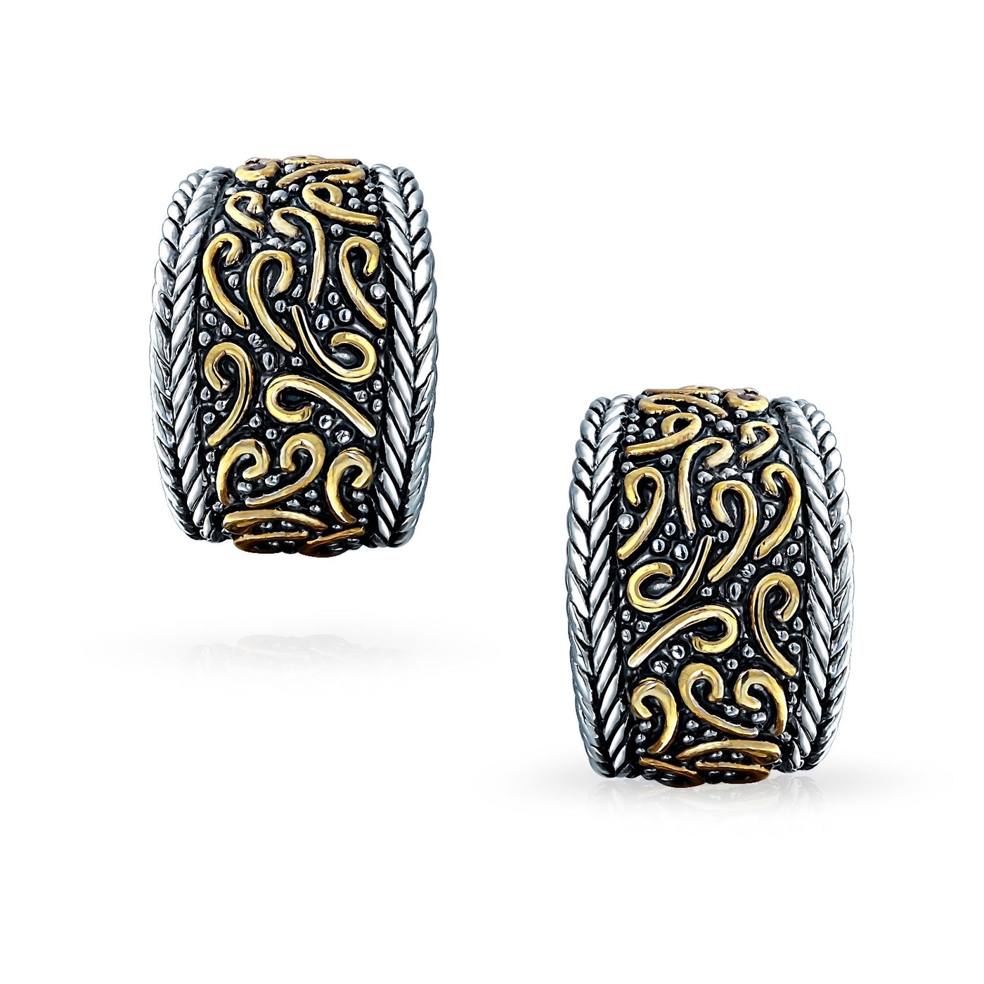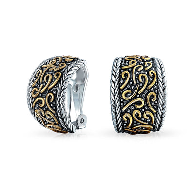 - BEAUTIFUL DESIGN - Uniquely stunning with intricate detail, these two tone, clip on huggie hoop earrings, for non - pierced ears are your perfect accessory for day or night. Featuring sublime, Bali style gold plated swirls against rhodium plated brass.