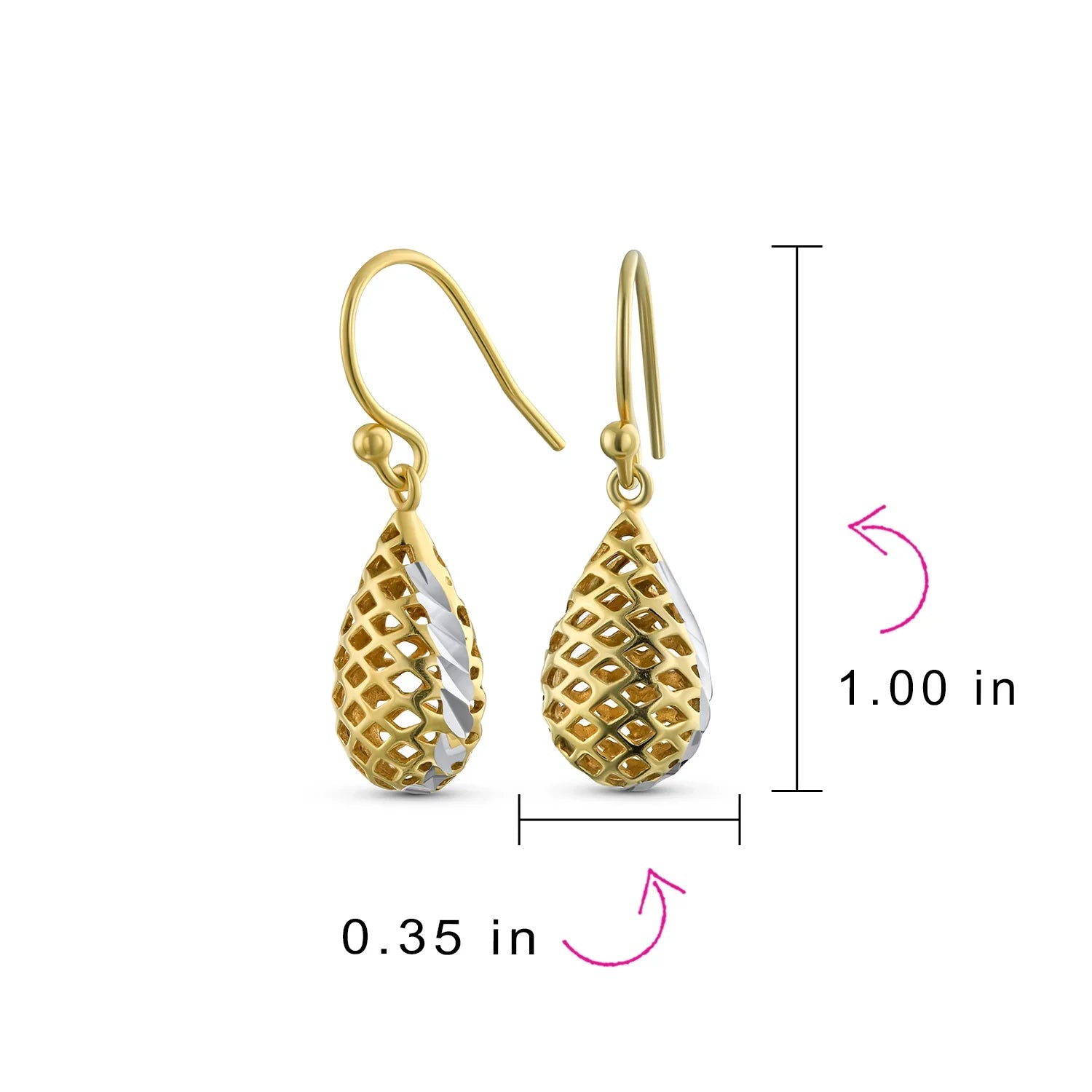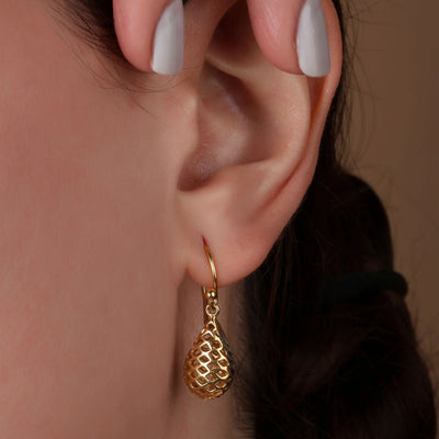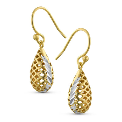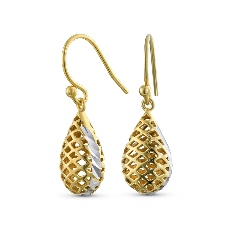 - Introducing our charming and lightweight Small Raindrop French wire Threader earrings. These earrings feature an intricate diamond weave pattern, adding a touch of elegance to any outfit. Designed with comfort in mind, they fit snugly in the ear thanks to the long fish wire hook, providing extra stability.