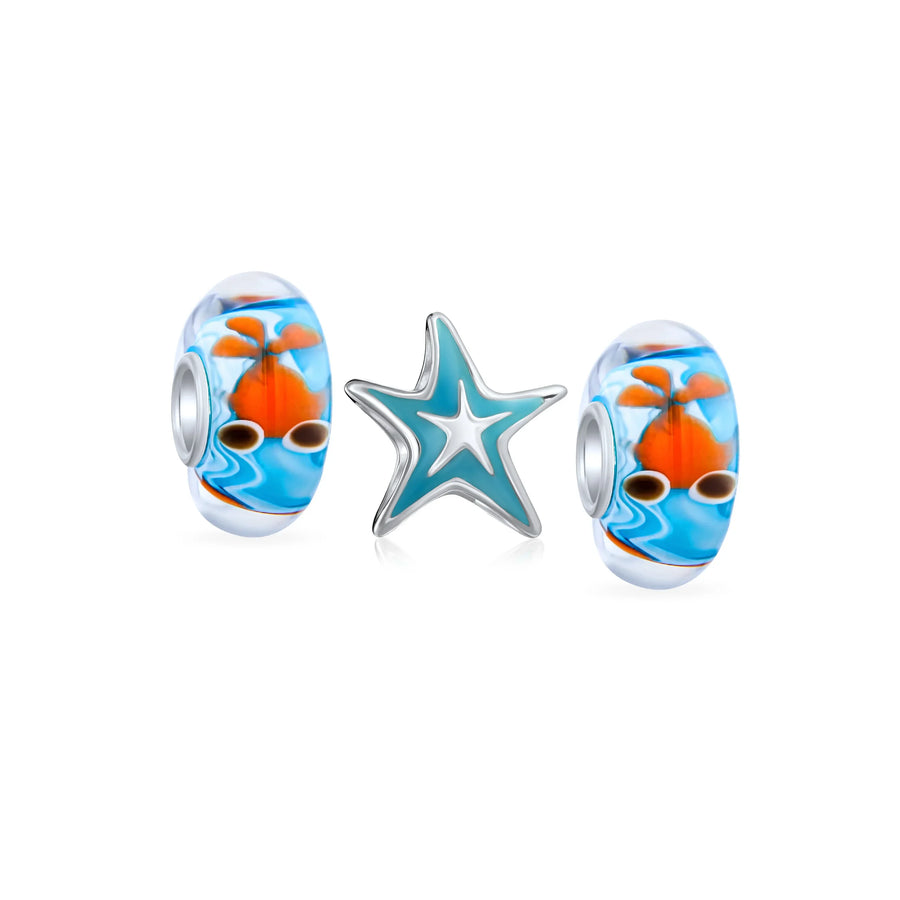 - Interchangeable charm bracelets featuring the Blue Starfish Nautical Animal and orange fish Murano glass charm. Crafted from 925 sterling silver, Murano glass, and glowing blue enamel, it's unique. Create a marine life-themed bracelet with other nautical beads. Ideal for ocean life enthusiasts.