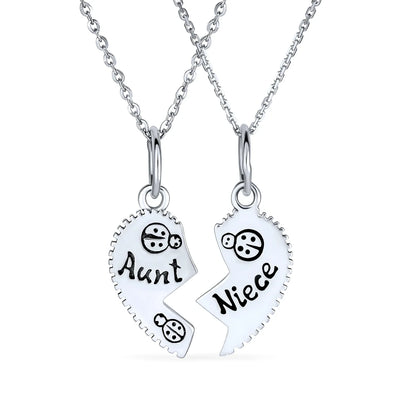 - Celebrate your special bond with this Aunt and Niece Split heart pendant Set. Crafted from .925 Sterling Silver, it features a split heart design. One piece says "Aunt" and the other "Niece," accented with charming ladybugs. Each pendant comes with a 16-inch .925 Sterling Silver chain. When joined, they form a darling heart. Perfect for any occasion, this aunt and niece puzzle pendant necklace makes a thoughtful gift. Don't miss out on these adorable heart-shaped pendant necklaces. Order yours today!