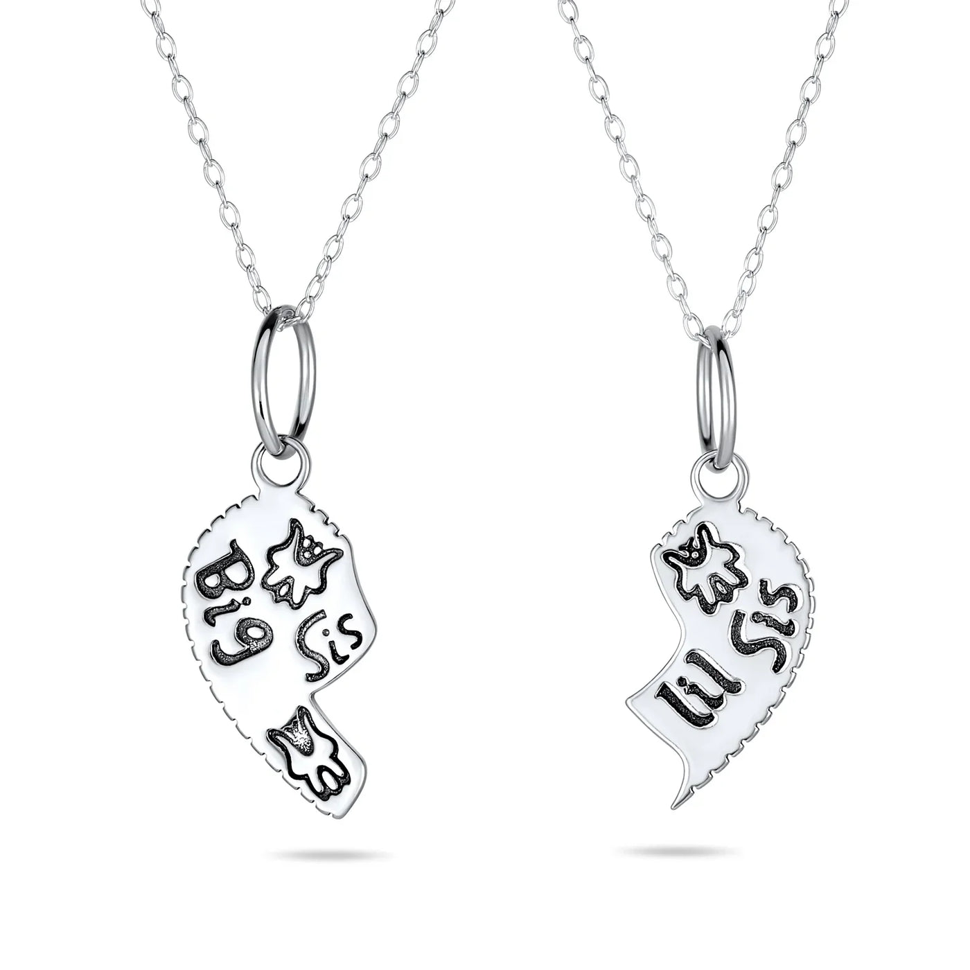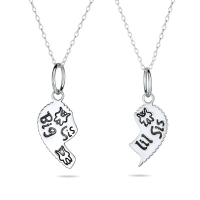 - Show off your sisterly bonds with this .925 Sterling Silver sisters BFF heart puzzle necklace. Celebrate your sisterly love in sensational style. This set of two heart puzzle necklace features a split, half-heart motif. One half reads "Big Sis," and the other "Lil Sis." A delicate butterfly detail adds a whimsical, feminine touch. Crafted entirely of .925 Sterling Silver with two 16-inch rolo chains included. Perfect for older and younger siblings alike. Share this super cute heart puzzle necklace set and cherish your sisterly connection.