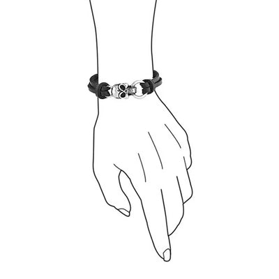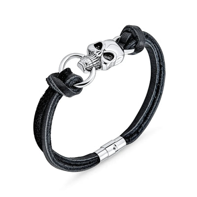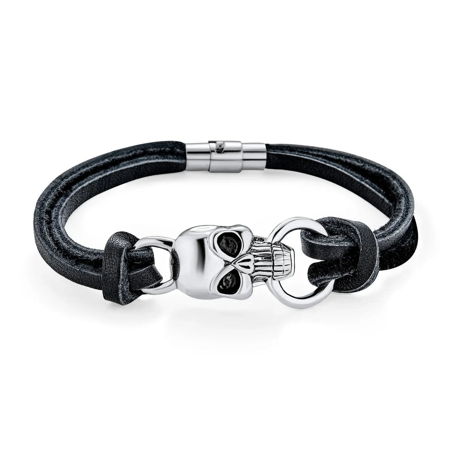 • STRIKING STYLE - Add a dash of punky edge with spooky allure to your style with this striking, cord bracelet. Highlighted by a dynamic, Gothic skull motif with oxidized stainless steel accents and two black, double knotted, leather cords.