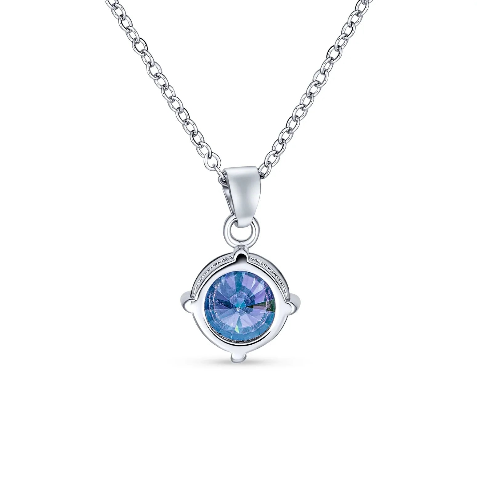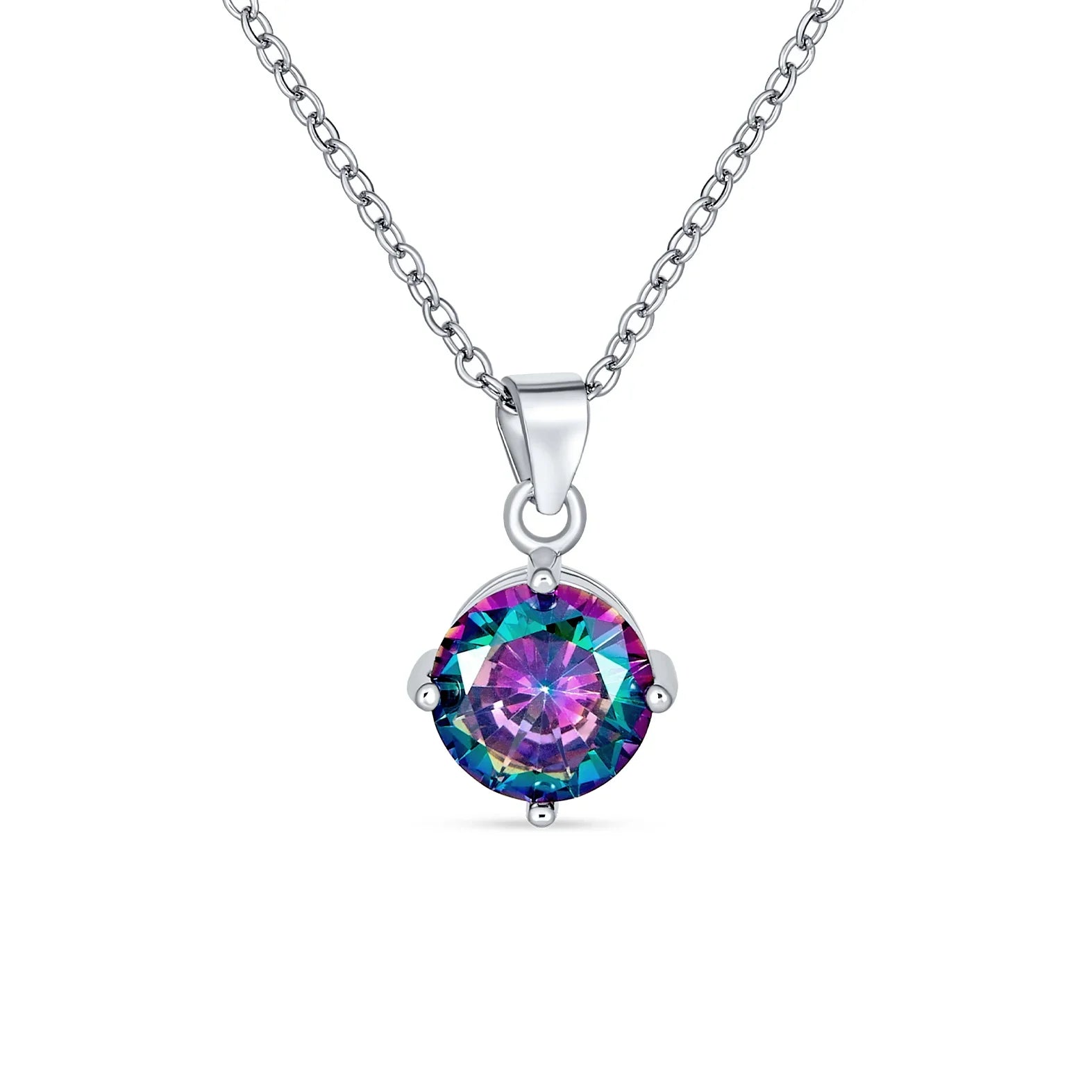 • This 0.63-inch round charm features a captivating simulated rainbow topaz face set in a basket setting with a sterling silver bail, making this solitaire necklace a versatile accessory for any outfit, from elegant ball gowns to casual blue jeans.