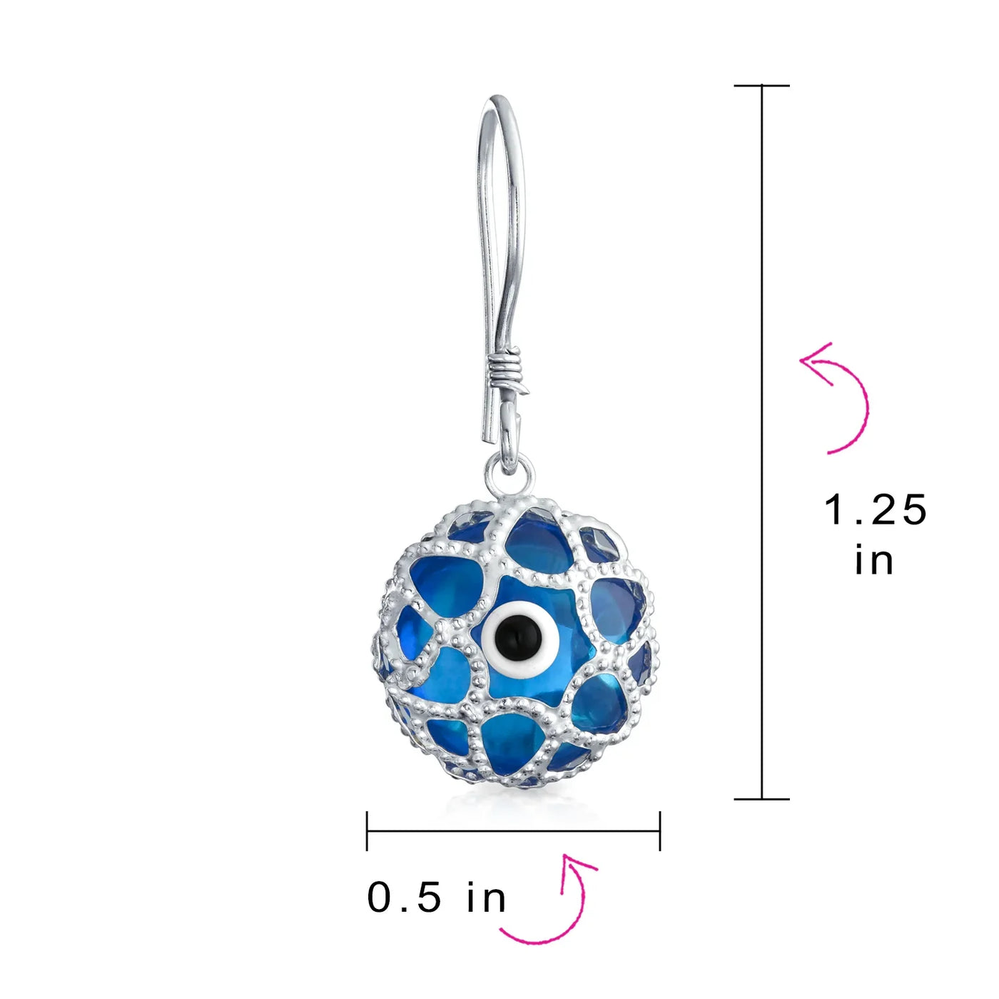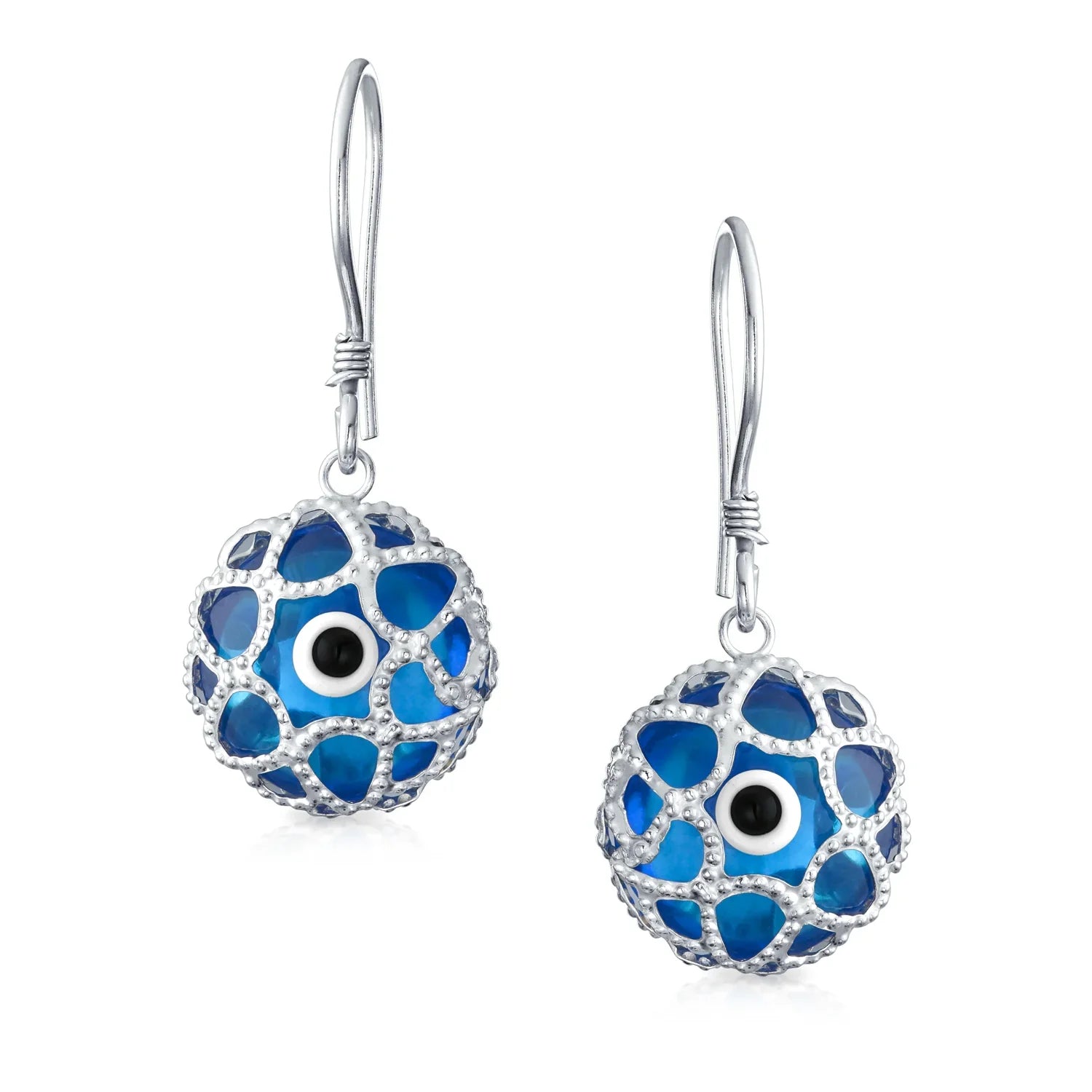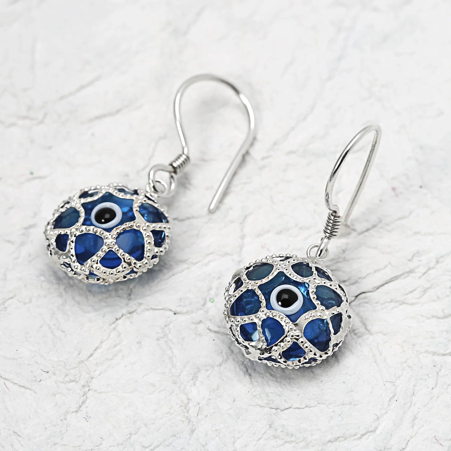 - Stand out with our unique Blue Evil Eye Filigree Drop Earrings. These stylish earrings feature a mystic evil eye in translucent glass. Crafted from radiant .925 sterling silver, they boast an intricate filigree design. Trendy and affordable, these earrings are a must-have. The ancient Middle Eastern evil eye is believed to attract spirits. No need for envy; these earrings will captivate everyone. Perfect as a gift for someone special.
