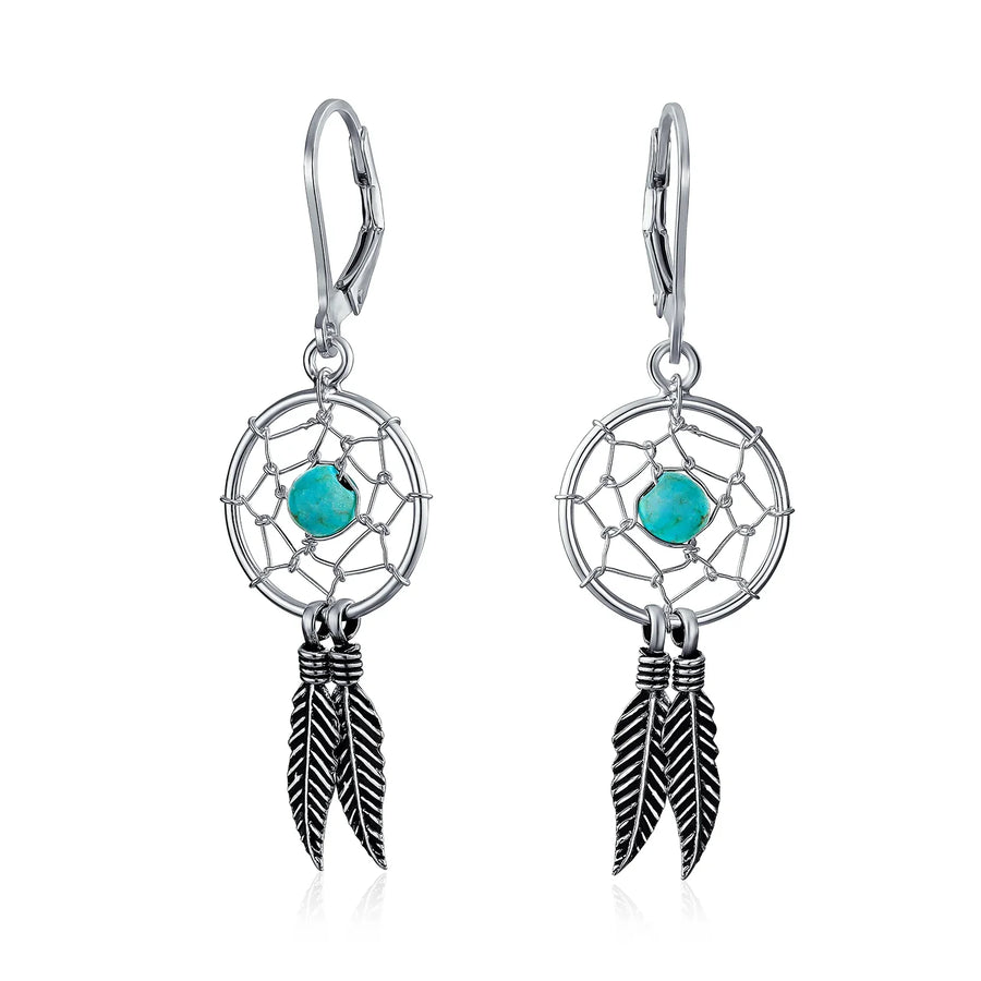 - Traditionally, dream catchers go above your bed. Now, wear them on your ears with these unique dream catcher earrings. Our sterling silver jewelry features detailed, woven dream catchers with dangling feathers and a bright stabilized turquoise ball. These lightweight feather earrings measure two inches and weigh less than three grams together. The intricate design of this Native American jewelry complements casual outfits perfectly. Pair with classic jeans and a t-shirt or your best Boho looks.