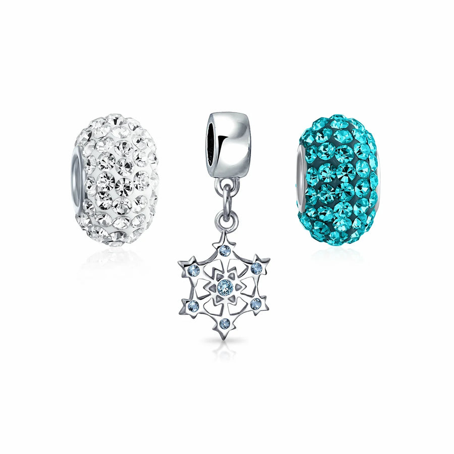 - Sparkling with simulated blue topaz cubic zirconia stones, our dangling snowflake bead is perfect for holiday celebrations. Dangling from a sterling silver round charm, this blue jewelry piece will get you in the holiday spirit. Featuring both blue and clear sparkling crystal beads, it's ideal for Hanukkah or snowflake bead jewelry. This bead set is a perfect winter-themed gift for your beads bracelet.