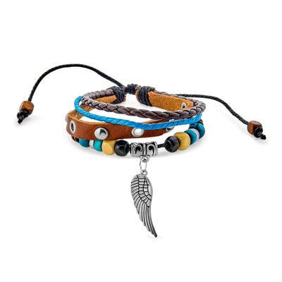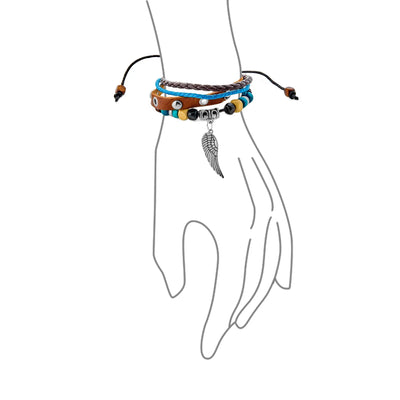 - Embrace a boho-chic style with this unique Zen wrap bracelet that combines eclectic design elements. The intricate design features leaves that symbolize Protection, Guidance, Remembrance, Freedom, Independence, and Spirituality. Crafted with genuine leather cords, a mix of metal and wood accents, beaded details, and a spiritual angel wing charm at the center, this bracelet exudes a laidback, free-spirited vibe.