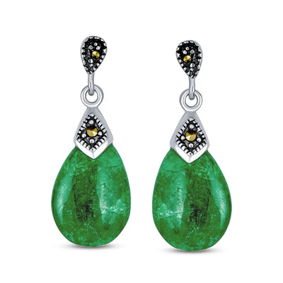 • Jade, the gemstone of purity, shines in our genuine jade dangle earrings. A marcasite stone adds a glimmer atop the jade teardrop. These 13mm art deco sterling silver earrings are perfect for vintage jewelry lovers. Brighten your face and receive compliments with our marcasite and jade earrings. Lightweight and comfortable, they secure with a post and friction backing. Order our sterling silver jade jewelry today for a touch of purity.