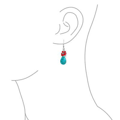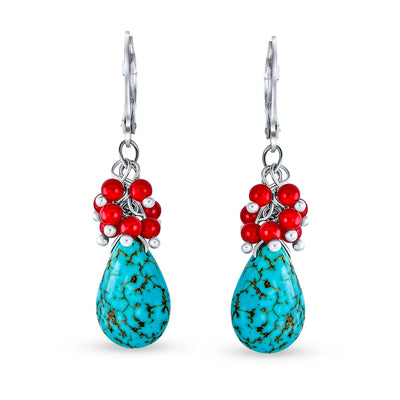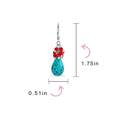 - Enhance your neutral outfit with our vibrant Turquoise and dyed coral drop earrings. Frame your face in stunning blue and orange. Rhodium plated Lever back earrings are perfect for everyday chic. Bright dyed coral beads complement the soft blue Turquoise teardrop. Match your outfit and mood with these head-turning gemstone earrings. Ideal for friends with pierced ears and December birthstone jewelry.