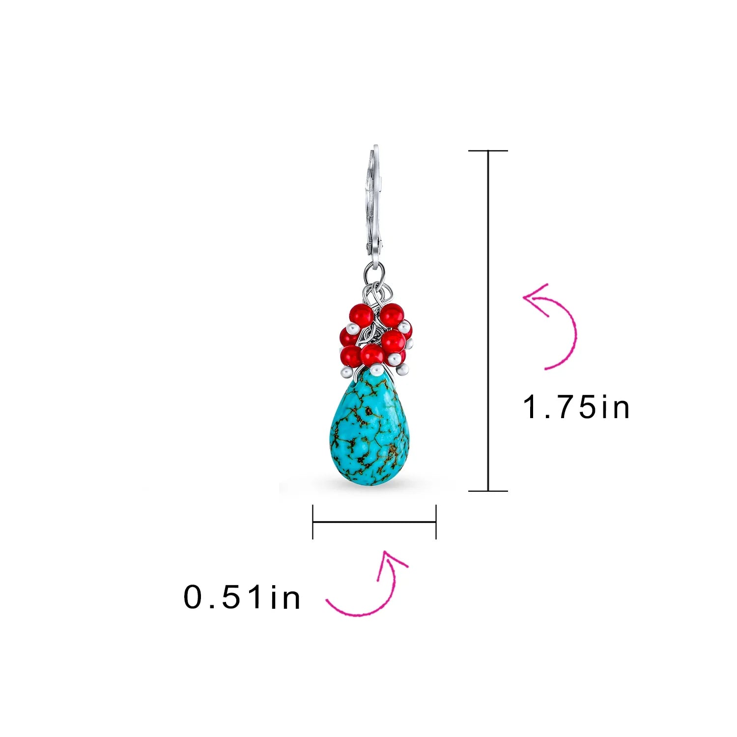 - Enhance your style with Bali-inspired turquoise teardrop earrings, featuring dazzling rhodium plating and vibrant dyed red coral. These 1.49-inch earrings make a perfect gift for December birthdays.