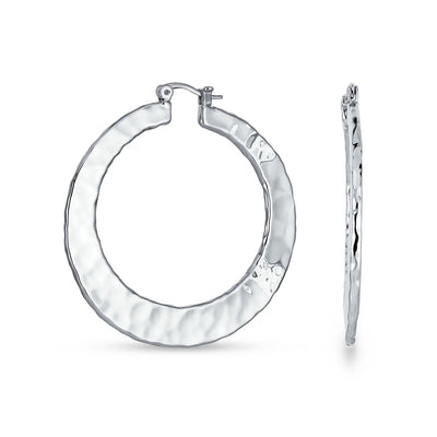- Every woman needs these radiant, rhodium plated, flat, 2in diameter brass hoop earrings, for pierced ears, in her jewelry collection. The dimpled texture, and shimmering brass make a strong fashion statement to give your look that extra pizazz every time.