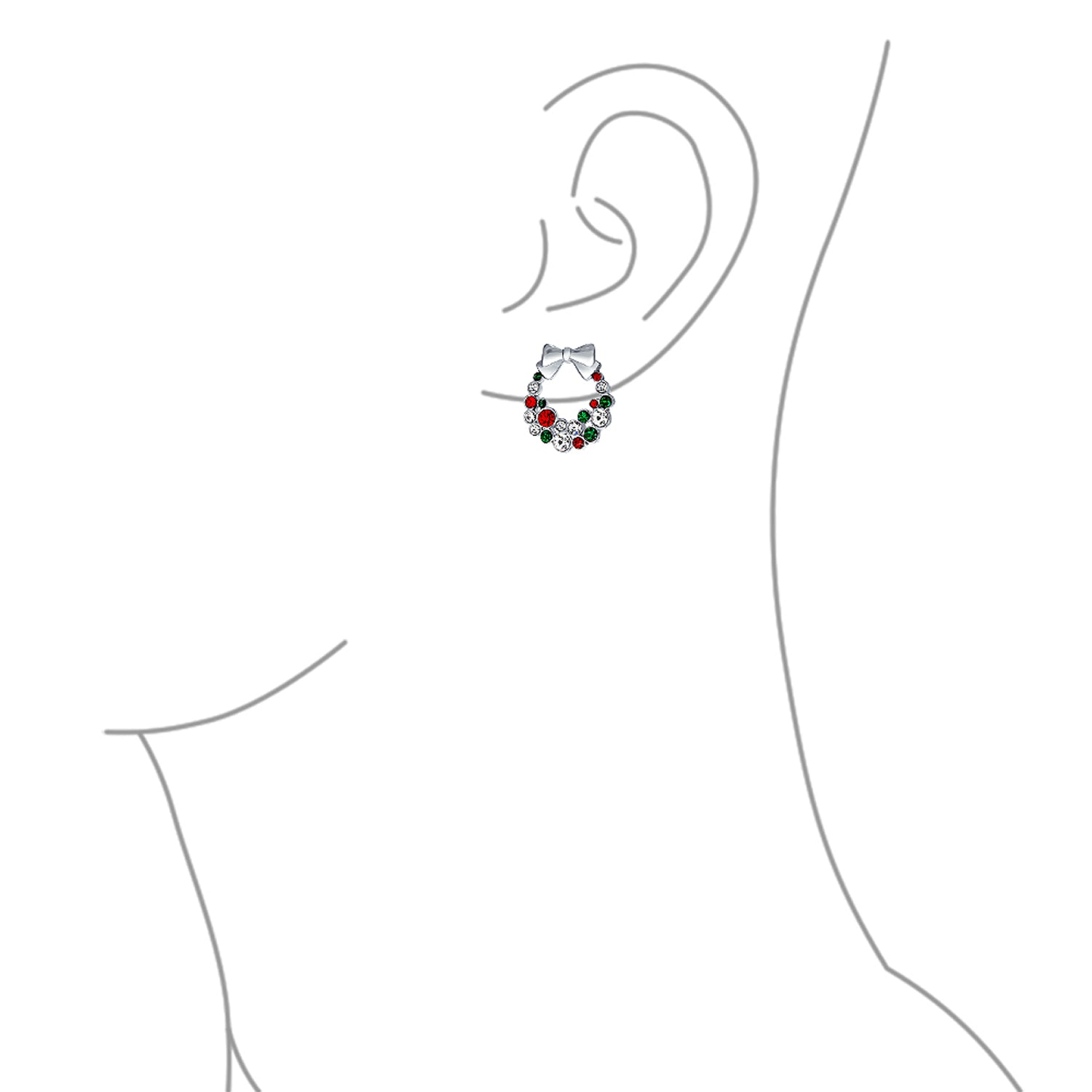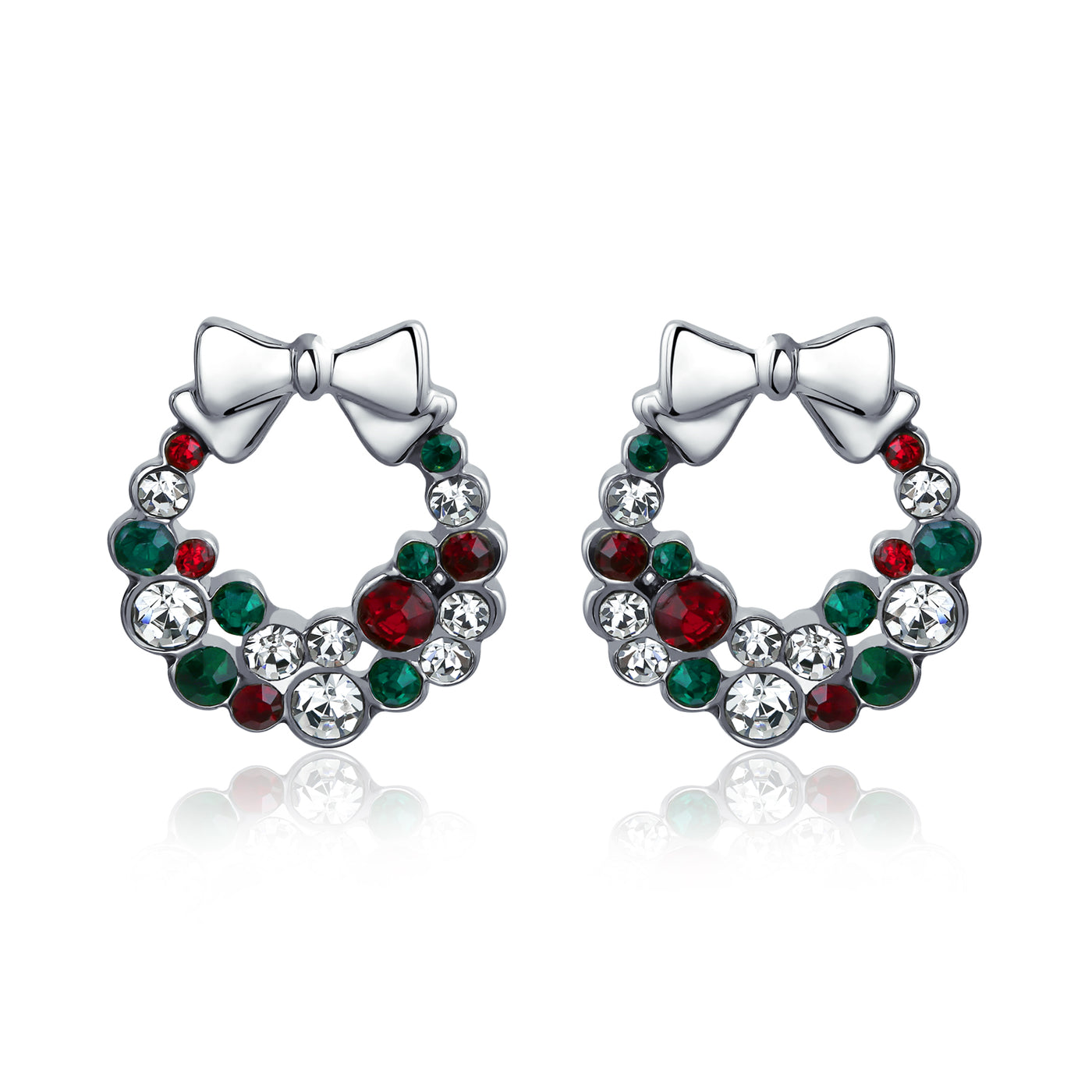- Embrace the holiday spirit with charming Christmas wreath stud earrings. Celebrate the festive season with Christmas-themed jewelry. These crystal stud earrings feature silver-colored wreaths adorned with red, green, and clear crystals, topped with a festive bow. Lightweight yet large, they make a statement without discomfort.