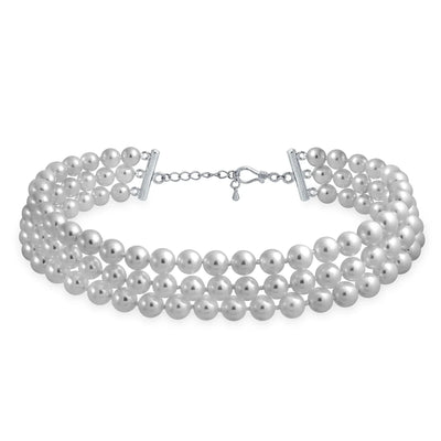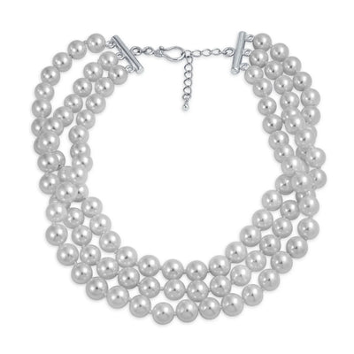 - Showcase your impeccable taste with our elegant three-strand Simulated Pearl choker necklace. Simulated pearls have never been more fashionable. This stunning multi-strand necklace will turn heads. Crafted with fine quality 8mm simulated pearls and a durable alloy. The 13-inch necklace includes a 2-inch extender and rhodium plating to resist tarnish. Three strands of shimmering beauty highlight your collarbone, giving you a radiant look. Perfect for weddings, this affordable bridal jewelry makes a cherished gift for your bridal party and the mother of the bride.
