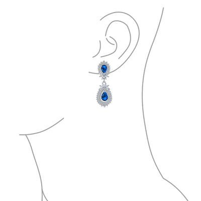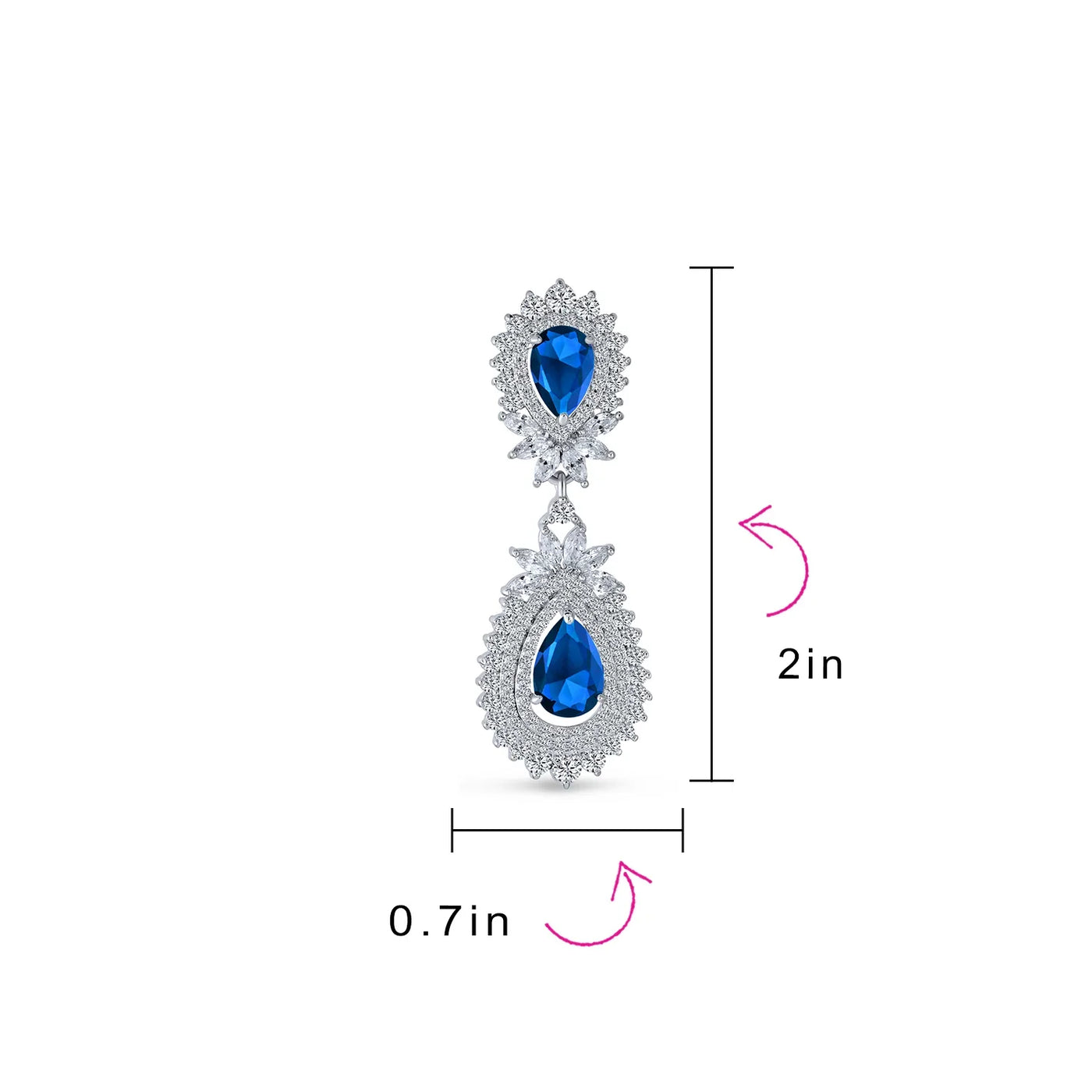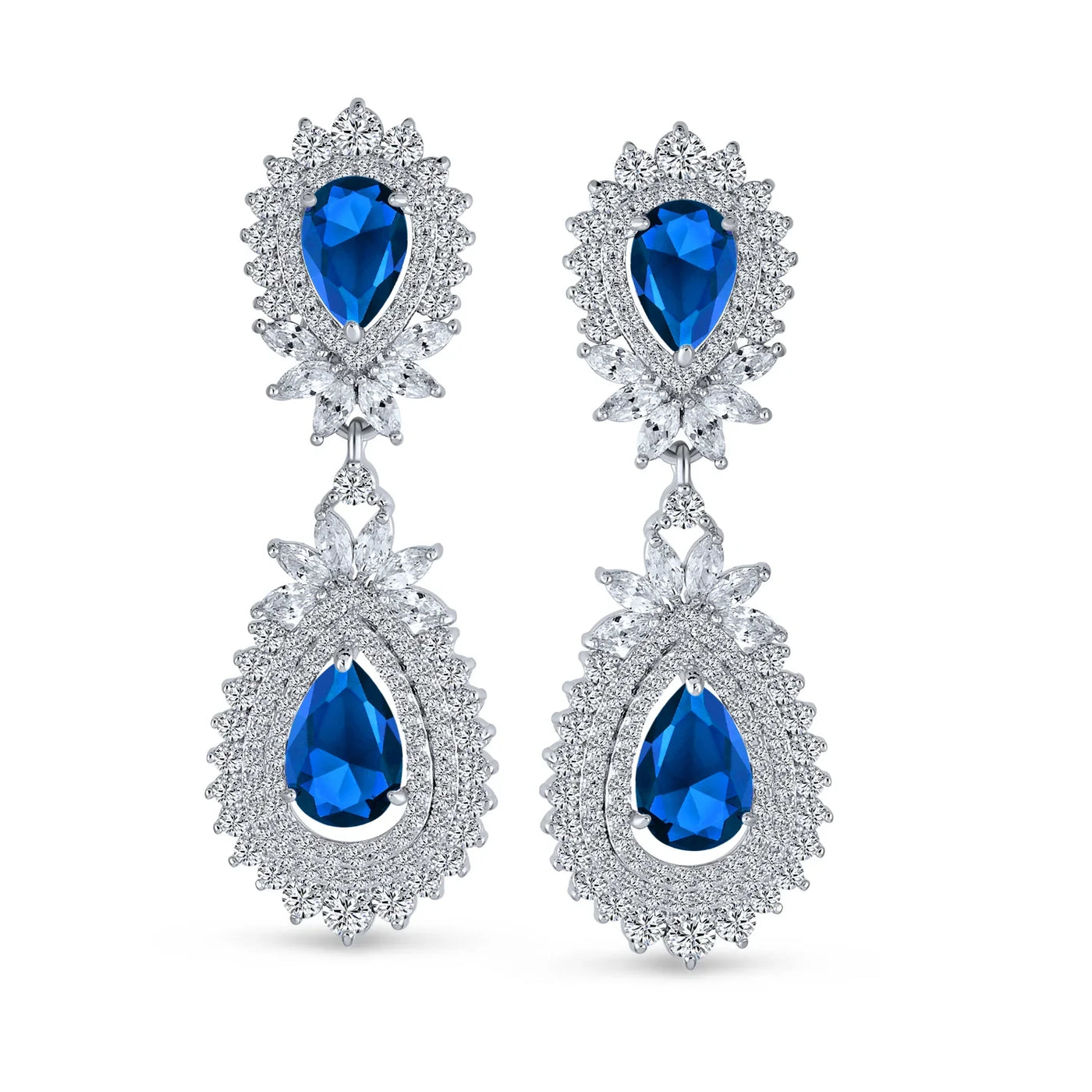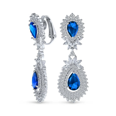 - Exquisite rhodium plated brass, clip on drop earrings to elevate your bridal ensemble and make any September smile. Highlighted by stunning 2 and 1.5 CT sapphire colored, pear czs in a double teardrop design with marquise CZ accents.