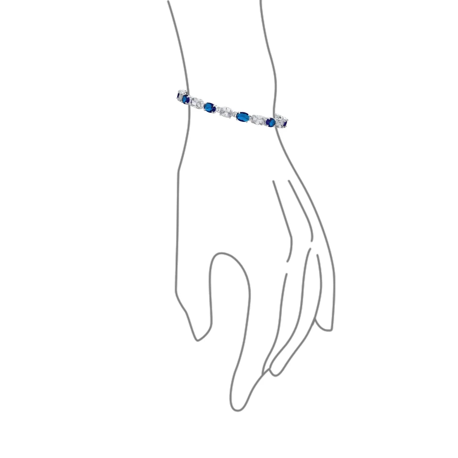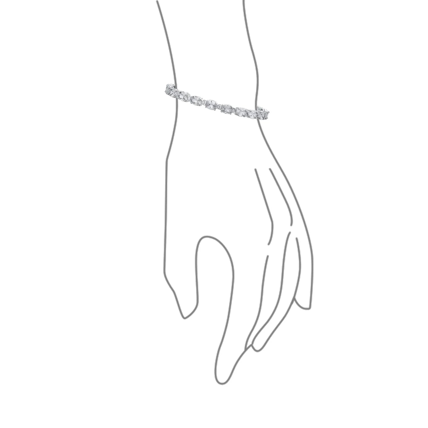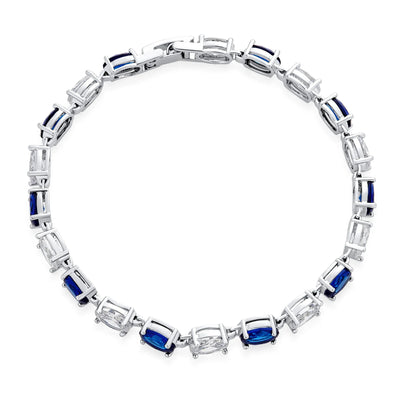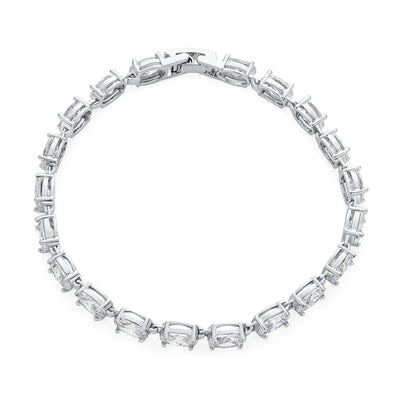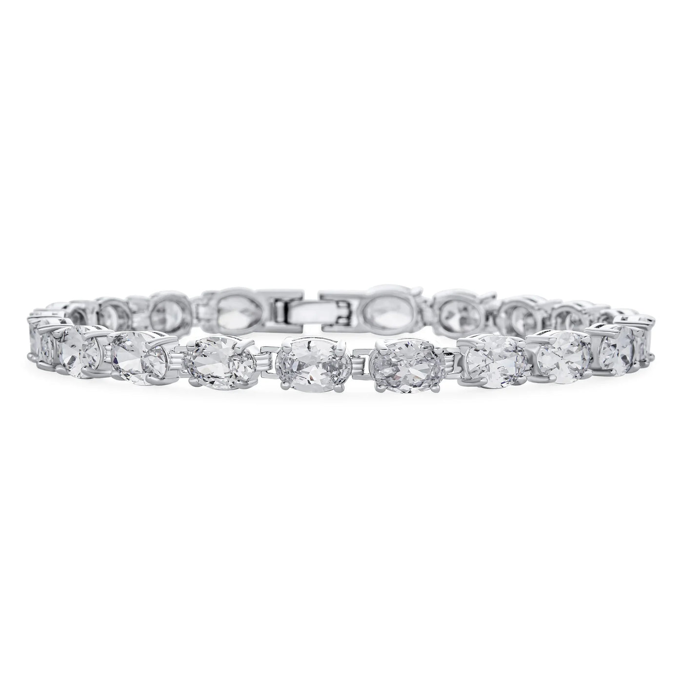 - This oval cut tennis bracelet is a significant jewelry item that is a must have in your jewelry collection. The essence of beauty is captured with this tennis bracelet. The gorgeous, glittering oval shaped CZs are set in 4 prongs each and cascade around your wrist to a box clasp closure with safety for confidence that your bracelet will stay with you. These lovely tennis bracelets are made from rhodium plated brass for a marvelous shine that keep you looking stunning. Show someone you love that you have an eye for beauty. This classic tennis bracelet wont let you down.