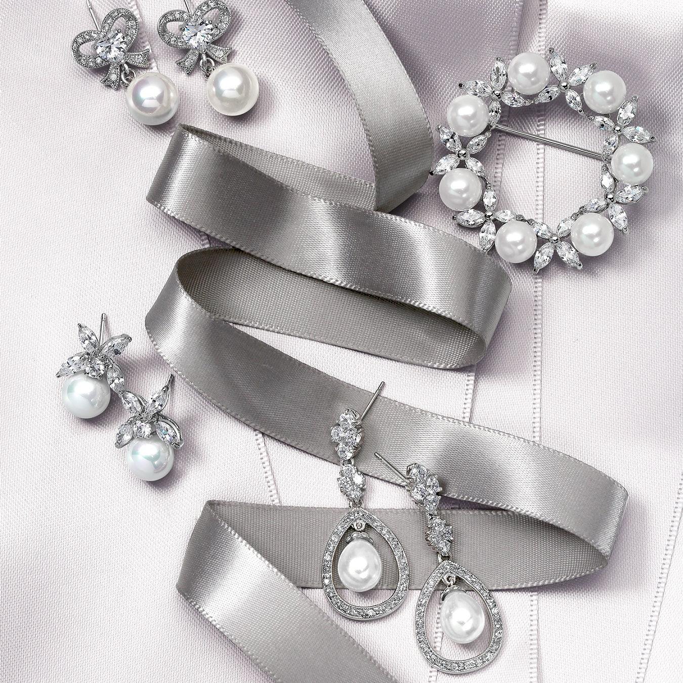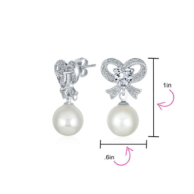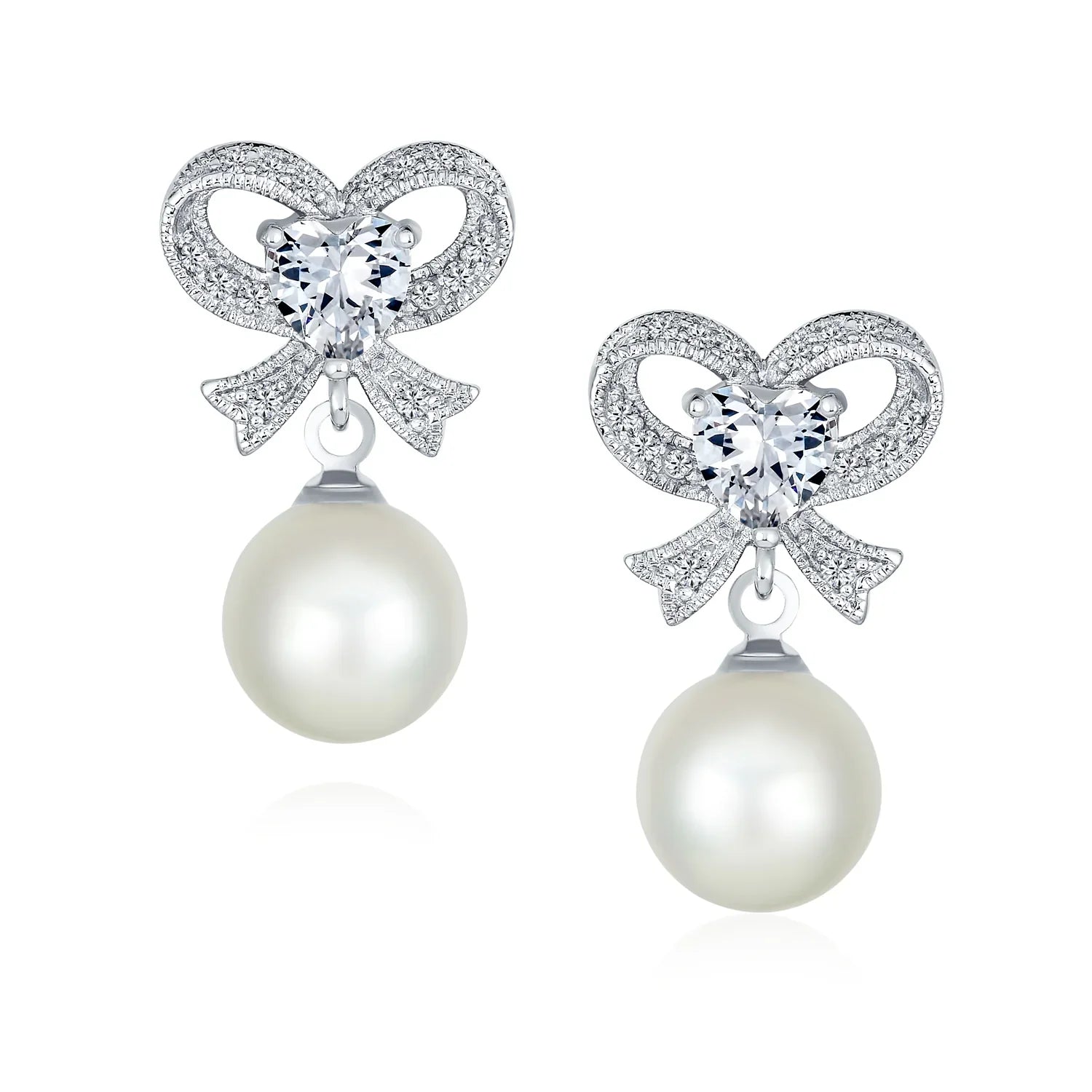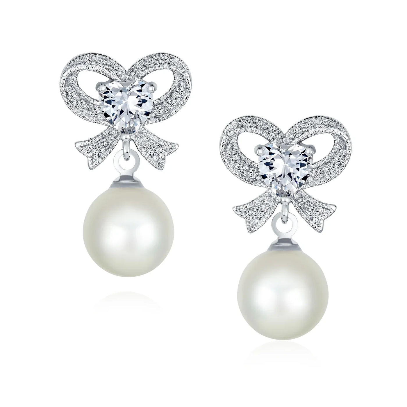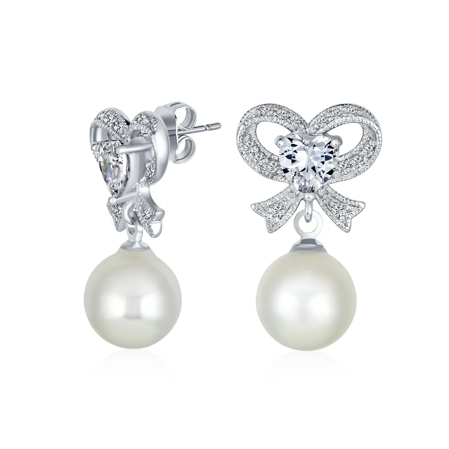 - A sumptuously feminine take on a traditional style. Enhance your bridal look with these exquisitely darling, pearl dangle earrings. A luminous, white 10mm round, glass pearl dangles daintily from a sublime, pave milgrain CZ bow.