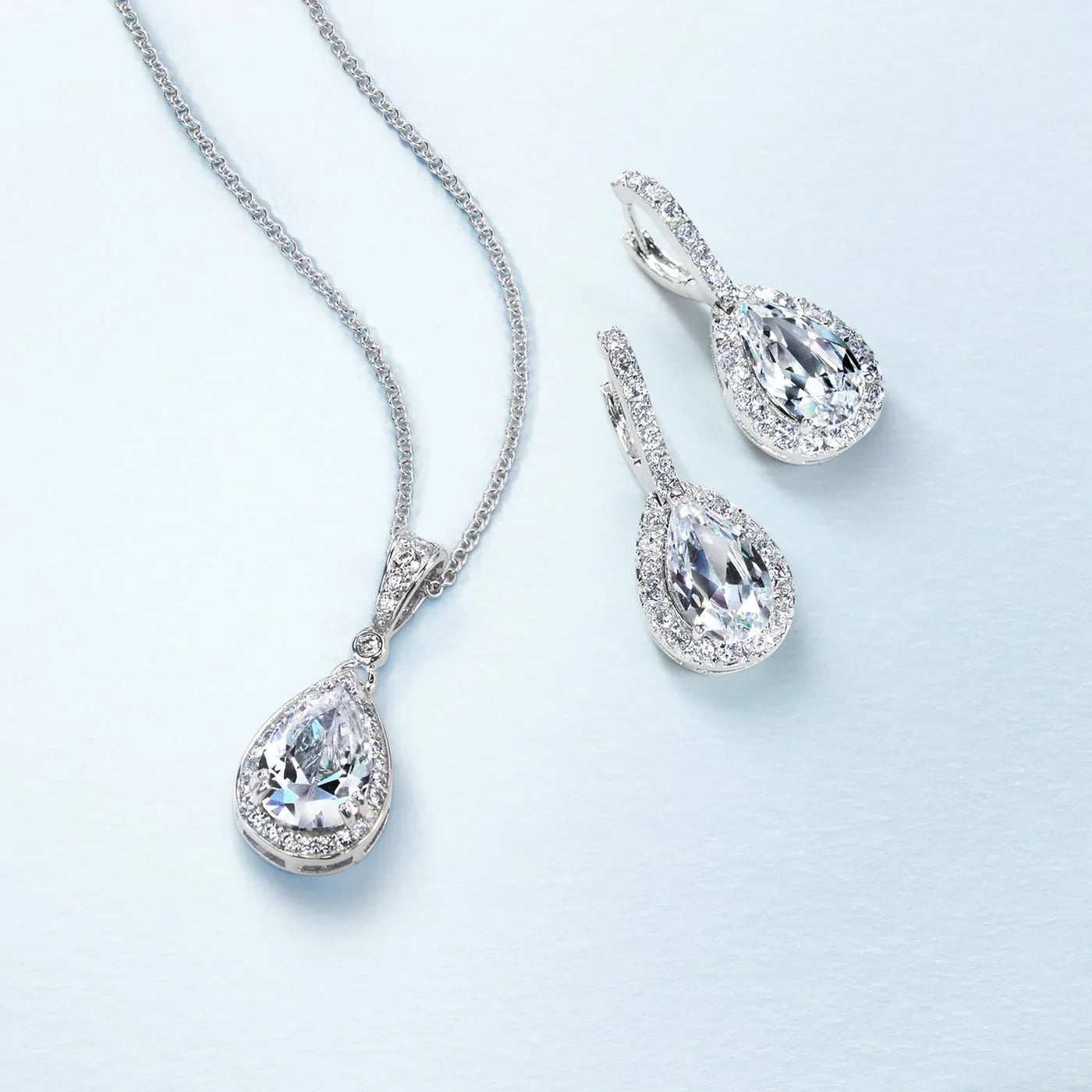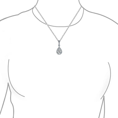• This CZ pear-shaped pendant, elegantly suspended on a chain, exudes sophisticated bridal style. The rhodium-plated drop necklace offers versatile wear, perfect for layering or dressing up or down.