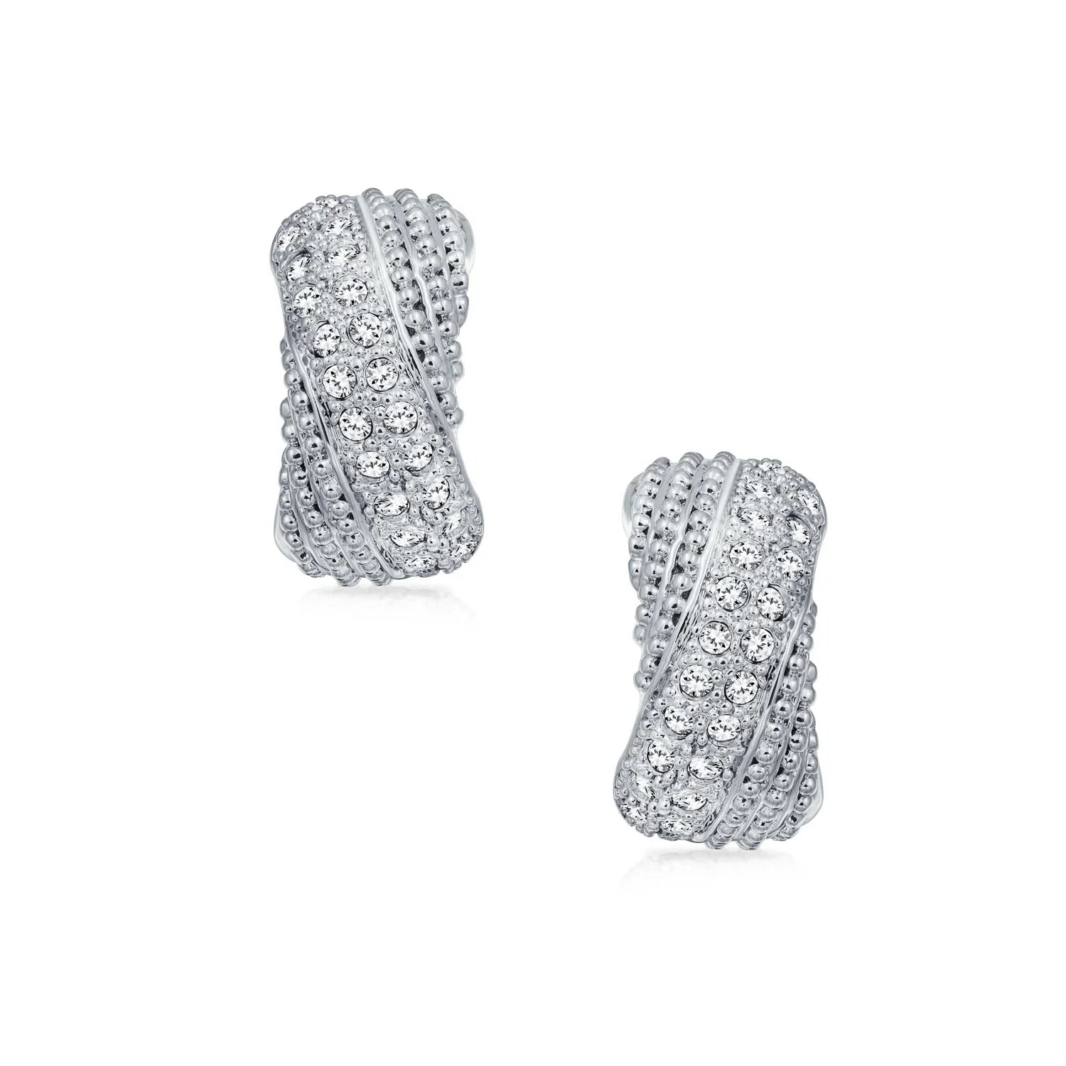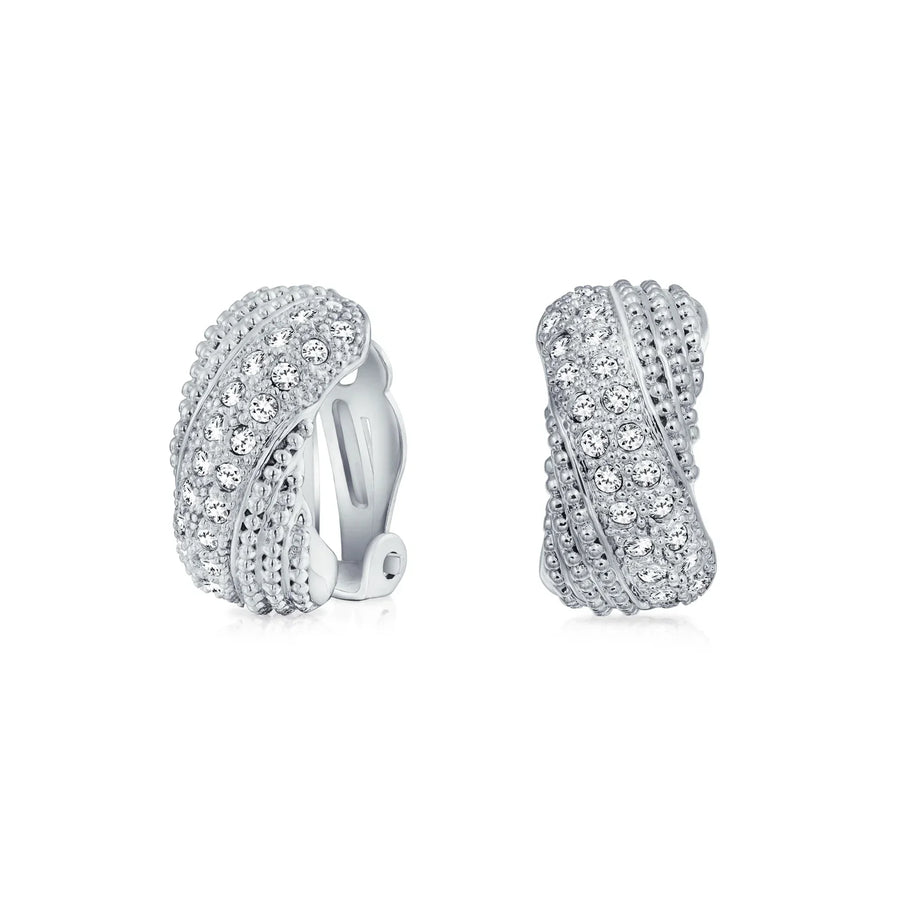 - STUNNING DESIGN - Add some sparkle to your summer look with our twisted row cubic zirconia clip on huggie hoop earrings. These CZ clip on earrings will work magic to glam up a cool summer suit or a smart maxi dress. Our CZ half huggie hoop earrings for women are designed for comfort and style. Let these striking CZ clip earrings help create some fabulous summer memories.
