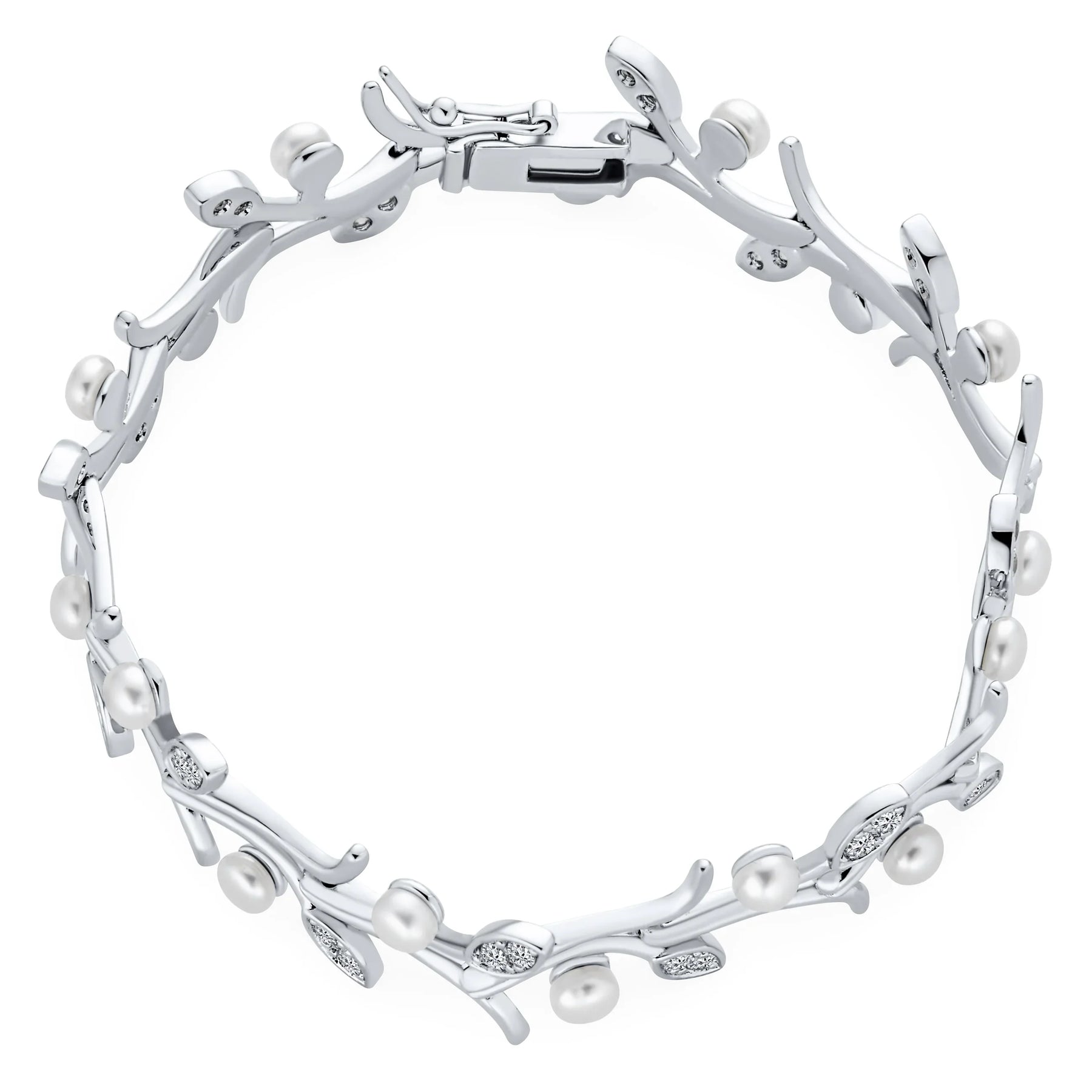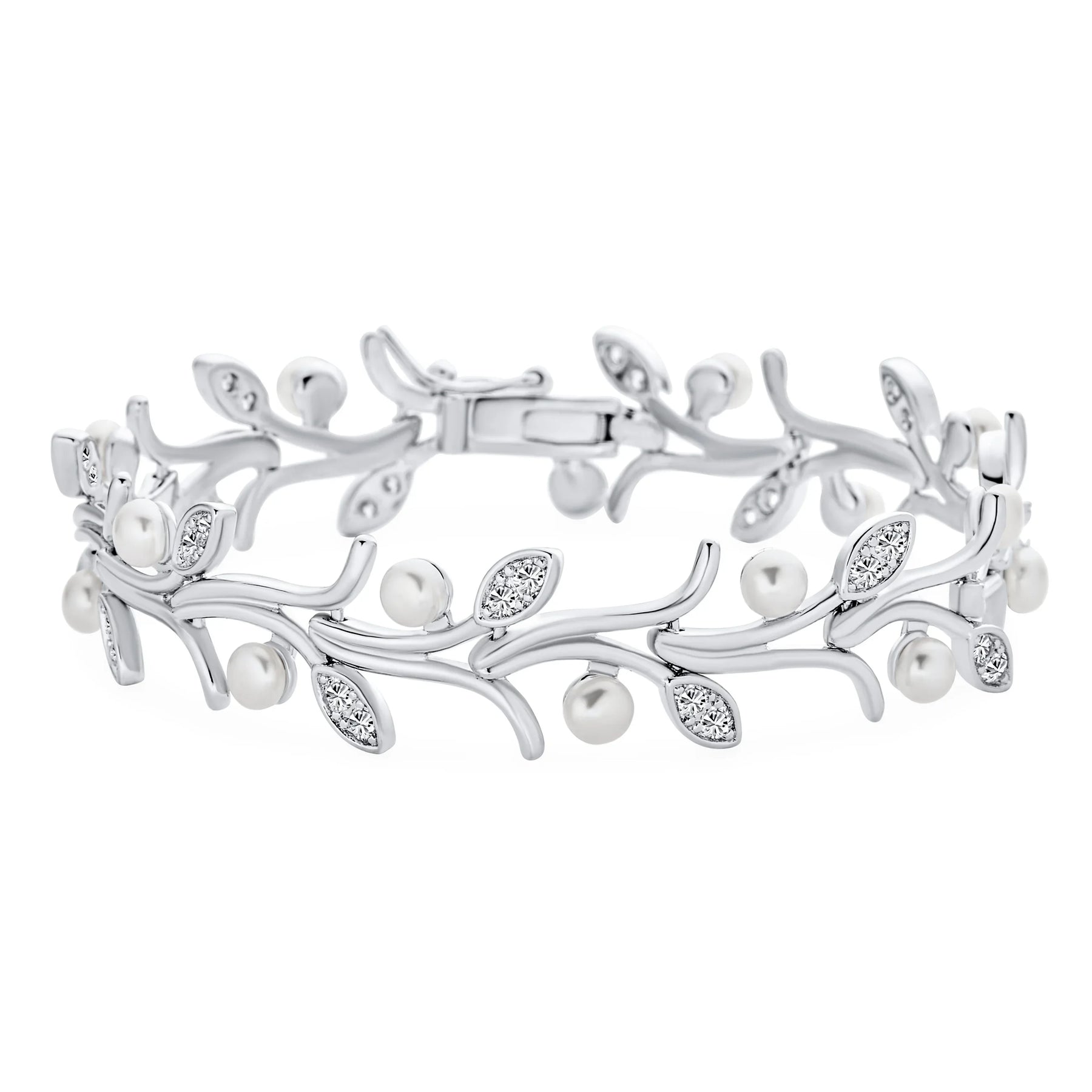 - This dazzling bracelet features round cubic zirconia stones, small pearls, and a secure box-with-tongue safety latch clasp. Ideal for brides, weddings, or special occasions.