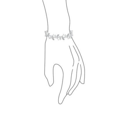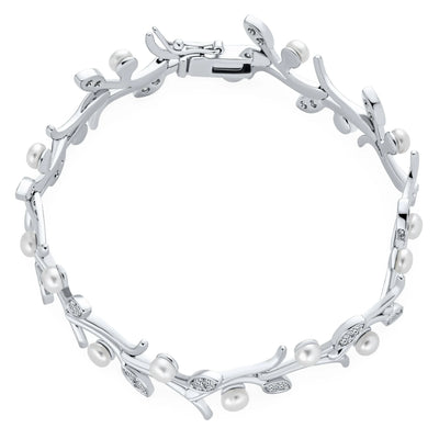 - Fashionable yet feminine and stunningly lovely design to elevate your look. White delicate pearls paired with pave leafs to create a floral vine of flowers . A stylish yet classic look your bridal party would appreciate, for any special occasions.