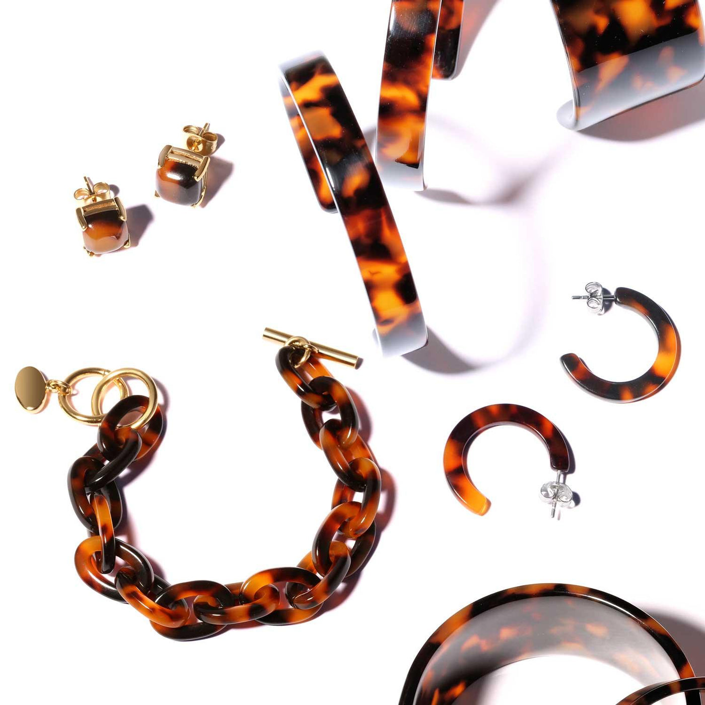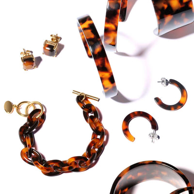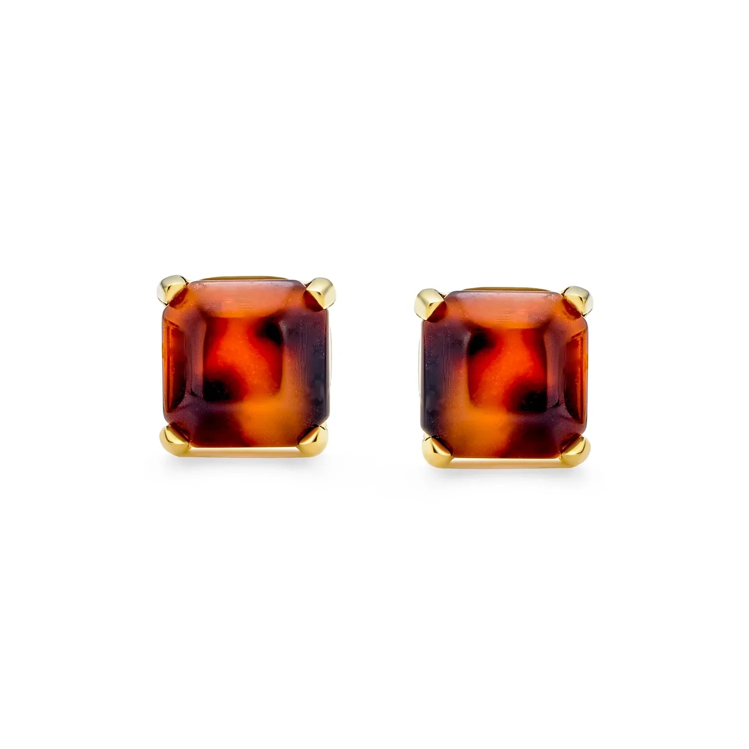 - These acrylic tortoise shell stud earrings feature a squared shape with IP gold plated stainless steel basket setting. Butterfly backings ensure they stay secure. Polished finish adds a slight shine. Timeless and durable, these classic earrings never go out of style.