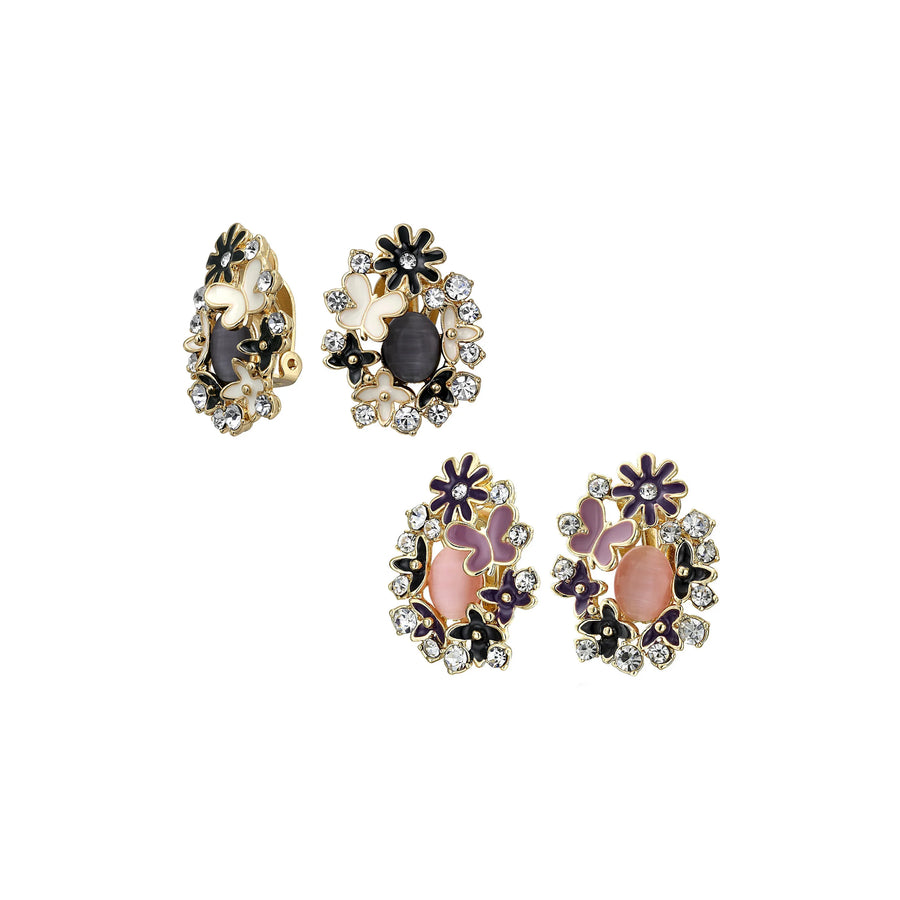 - A springtime garden for non-pierced ears, these ethereal gold-plated brass clip-on earrings showcase a simulated pink cat's eye bead at the center, adorned with purple and black enamel butterfly and flower motifs, and sparkling crystal accents in a feminine design.