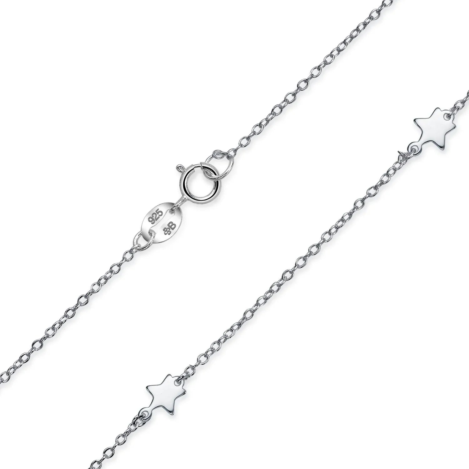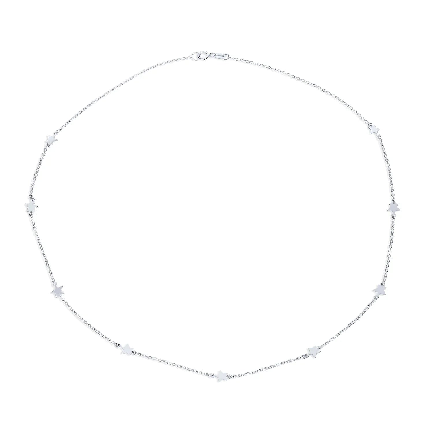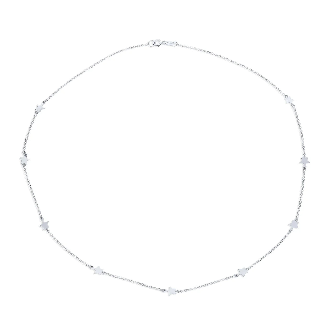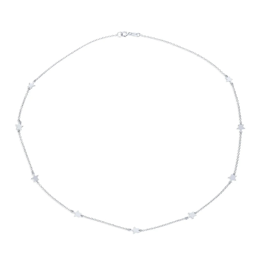 - Enhance your style with our stunning Star Necklace Jewelry, blending celestial charm and patriotic spirit. Crafted from e-coated .925 Sterling Silver, this station necklace features nine petite stars on a dainty rolo chain. The necklace hangs at a perfect 18 inches, making it a versatile and eye-catching accessory. Treat yourself or a friend to this beautiful silver star necklace today and add celestial beauty to any outfit.
