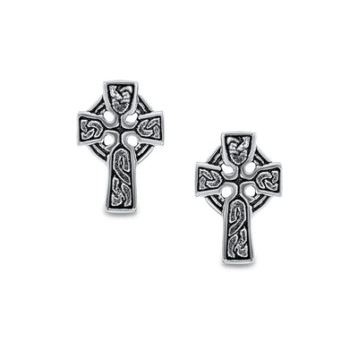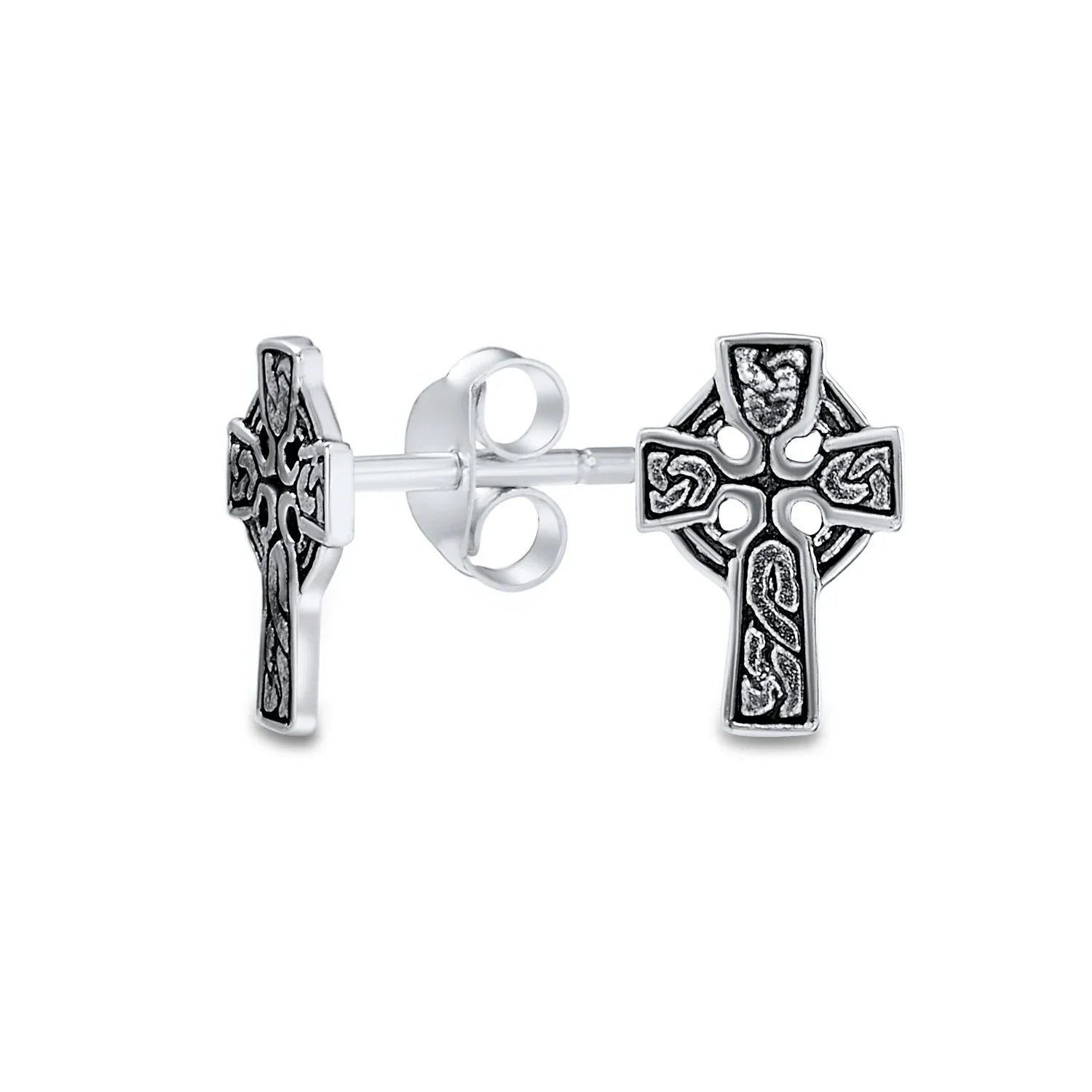 Religious Celtic Knot Cross Stud Earrings in Oxidized Sterling Silver for Men - Bling Jewelry