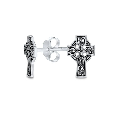 Religious Celtic Knot Cross Stud Earrings in Oxidized Sterling Silver for Men