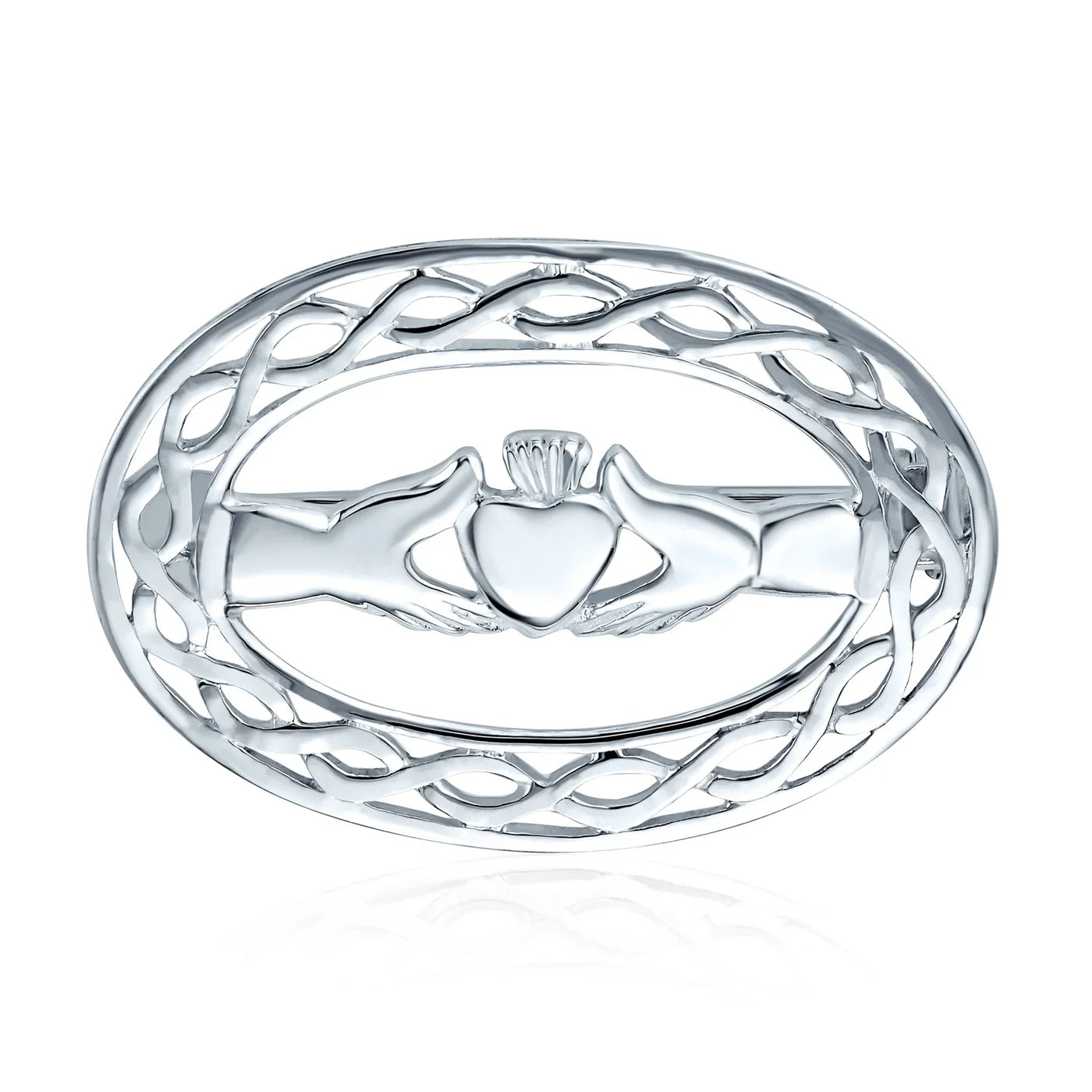 - Celebrate your Irish heritage with our exquisite Claddagh jewelry. This traditional piece symbolizes love, loyalty, and friendship, perfect for gifting. The detailed design showcases two hands holding a heart, crowned to represent friendship, love, and loyalty. Made from premium sterling silver, our pin is polished to a brilliant shine, adding elegance to any attire. Indulge in a stunning piece of Celtic Knot jewelry today.