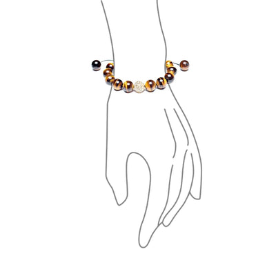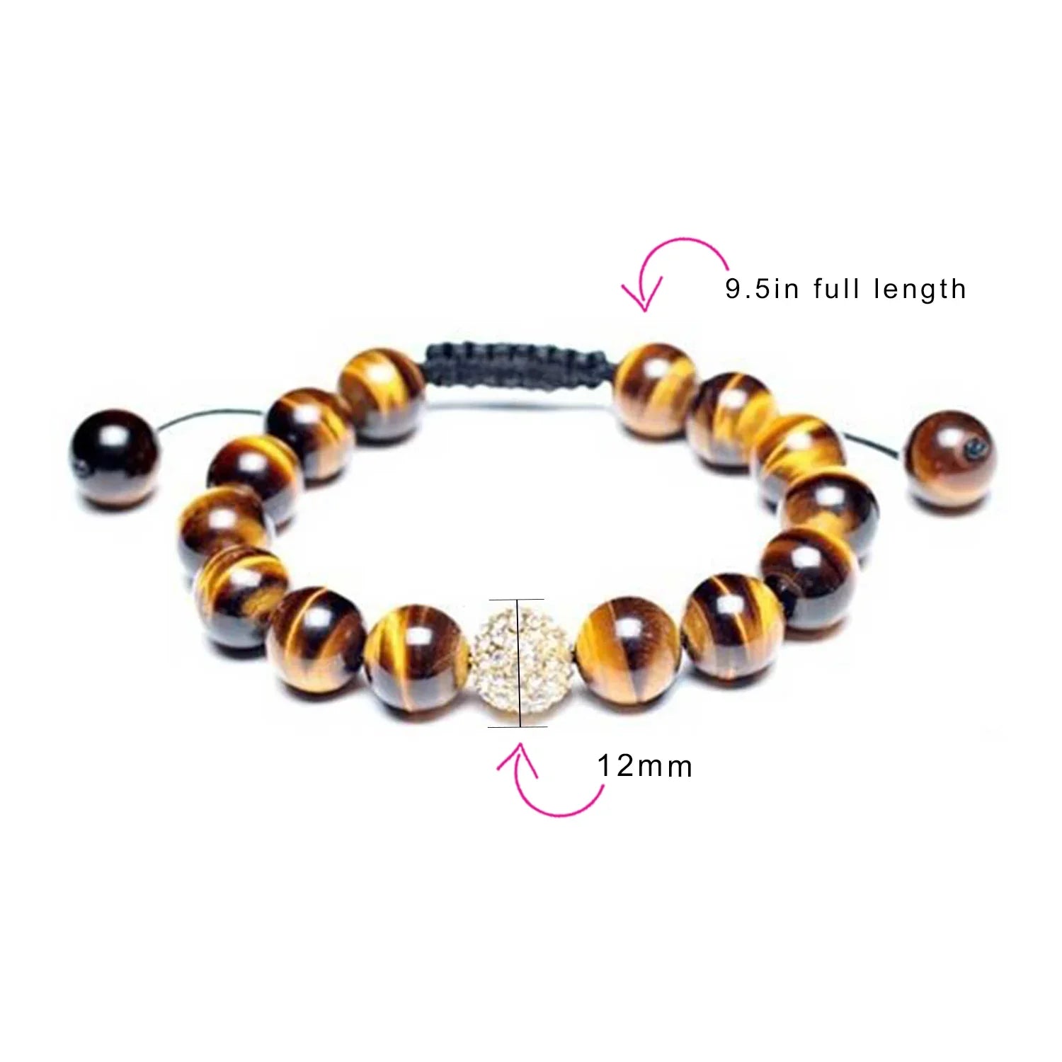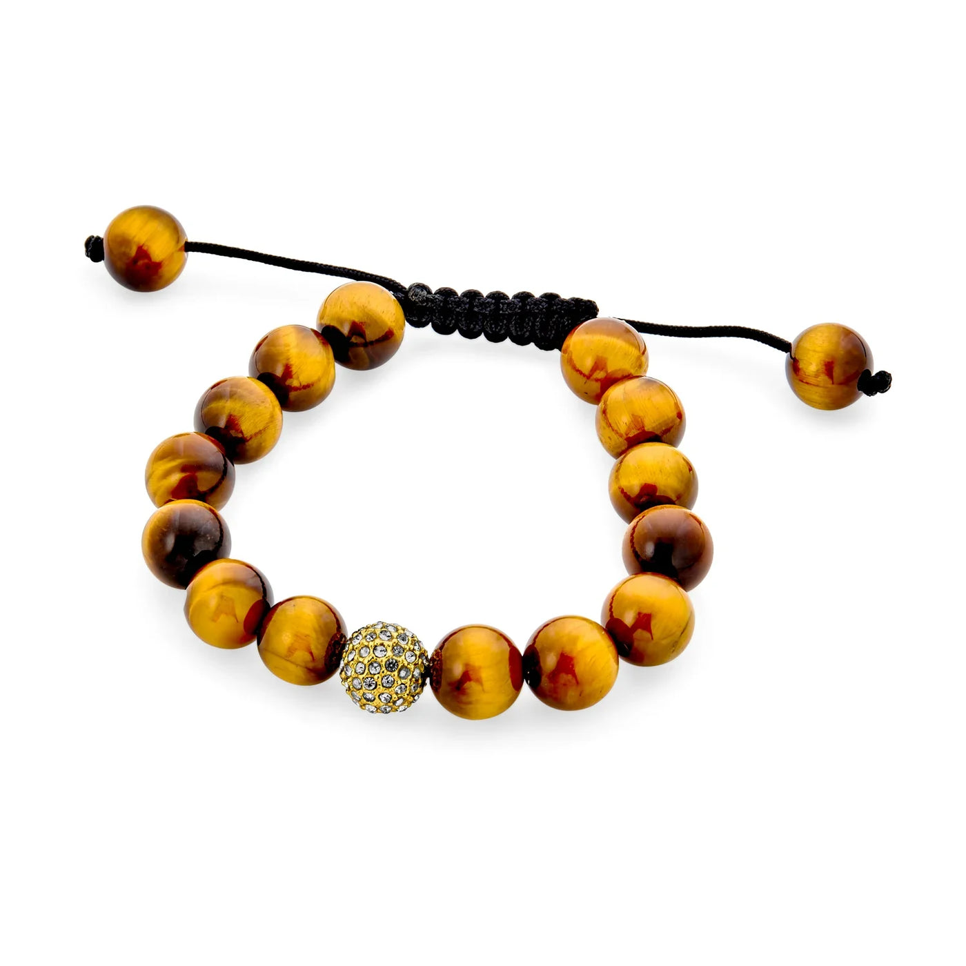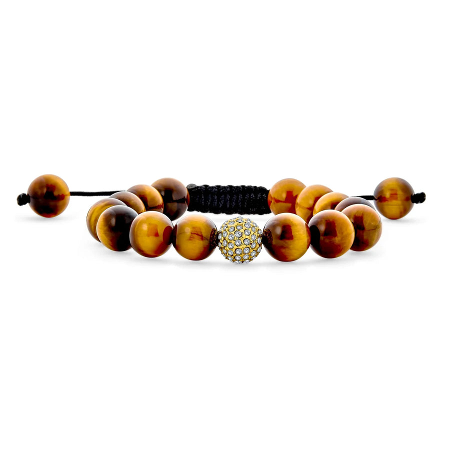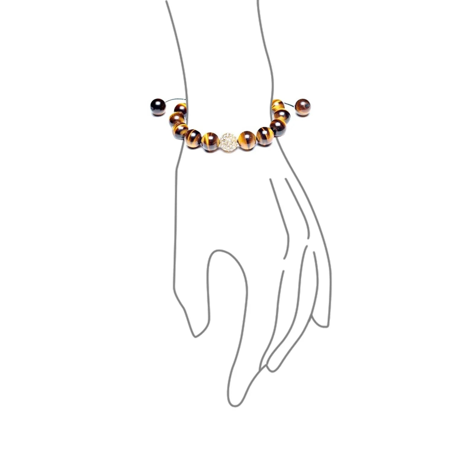 - This Tiger Eye beaded bracelet enhances focus and mental clarity. Known as a protective stone, it promotes relaxation and meditation. Inspired by Shamballa Jewels, it's popular among yogis. Feel the vibes with this Gold plated Tiger Eye piece. Features a crystal disco ball bead at the center. Gold Plated metal and clear crystal complement the brown beads. Ideal for men seeking a subtle Shamballa-inspired bracelet. Perfect for casual outfits, it's a daily favorite. Adjustable fitting ensures easy wear and a custom fit. Great unisex jewelry piece for yourself or as a gift. High-quality Shamballa-inspired design, perfect for friends and loved ones.