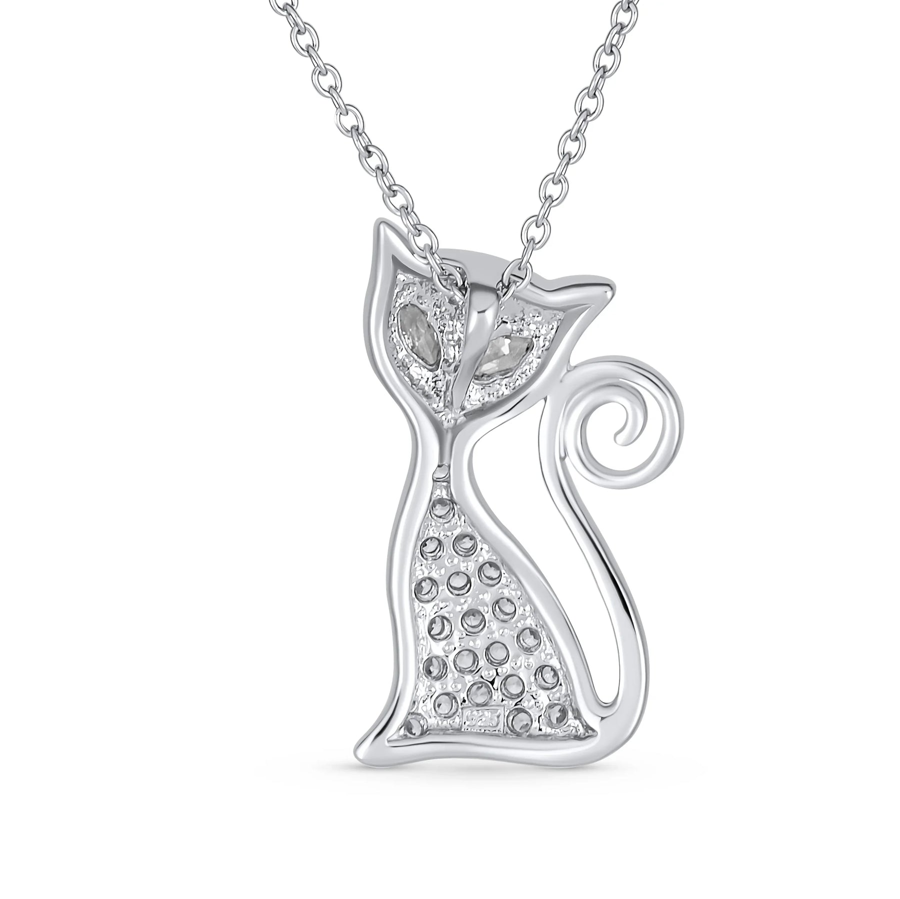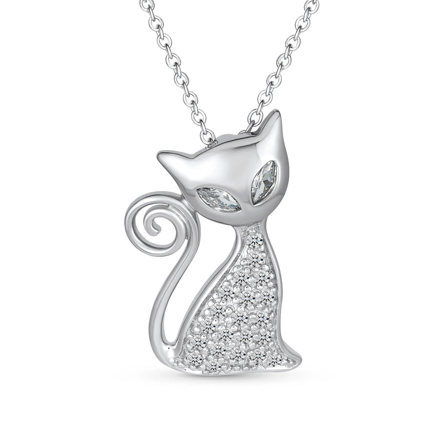 - Discover our charming .925 Sterling Silver sitting cat pendant. Adorned with marquise cut Cubic Zirconia eyes and pave Cubic Zirconia body. Crafted from high-quality .925 Sterling Silver and rhodium plated for lasting shine. Lightweight design with included chain. Perfect for any animal jewelry collection. Embrace its timeless beauty and unique cat-themed elegance.
