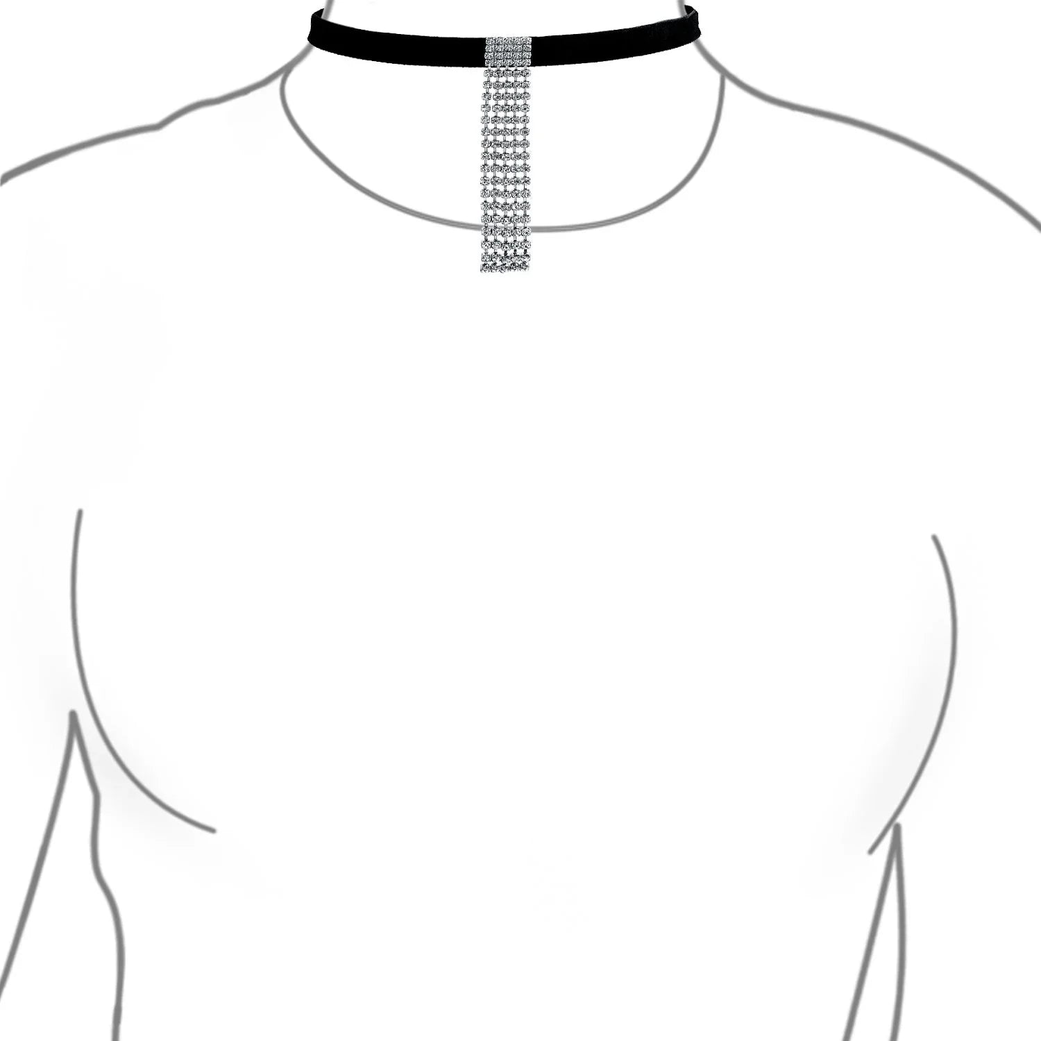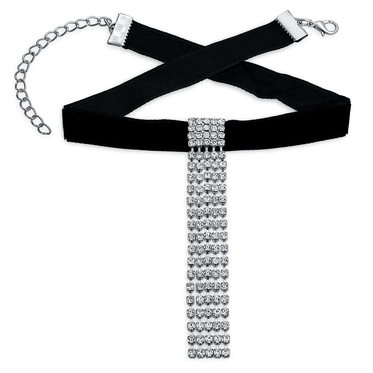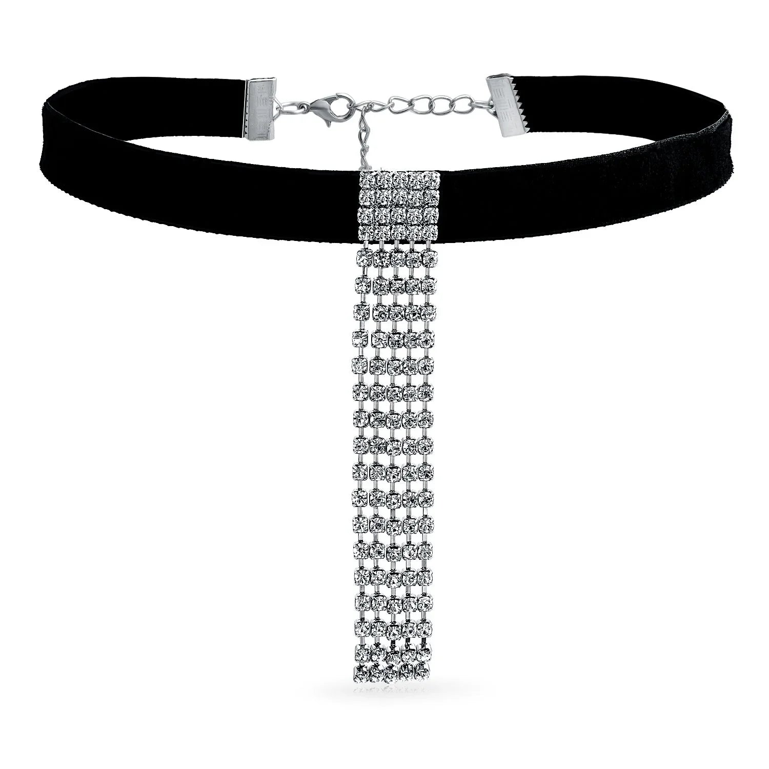 - Add glam to your look with our velvet rhinestone choker necklace. Rhodium plated alloy and velvet with cascading rhinestones. Perfect for cocktail dresses or casual outfits. Turn heads with this stunning rhinestone choker.