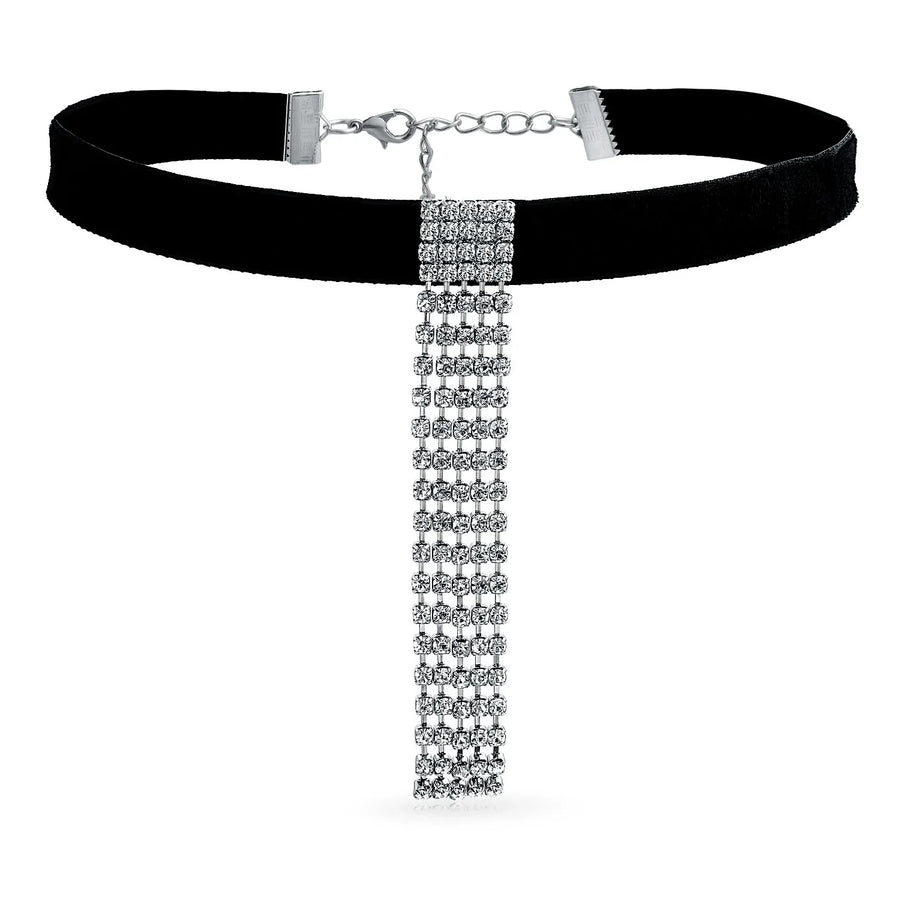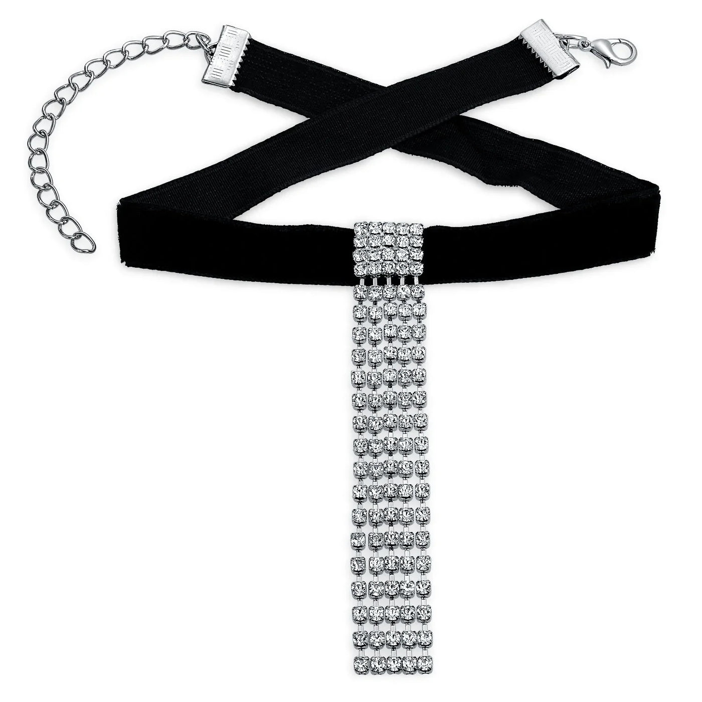 - This captivating velvet choker necklace makes a striking fashion statement, featuring a 12.5-inch length with a 3.5-inch rhinestone waterfall centerpiece. The lobster claw clasp ensures easy wear and a versatile fit for any outfit.