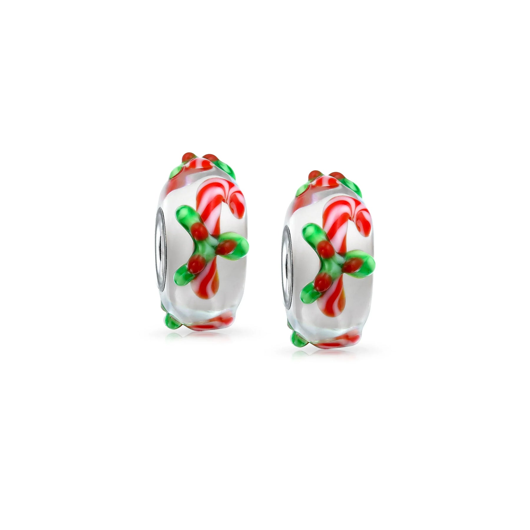 Set of 2 Christmas Charm Bead Red Candy Cane Peppermint Murano Glass Silver - Bling Jewelry