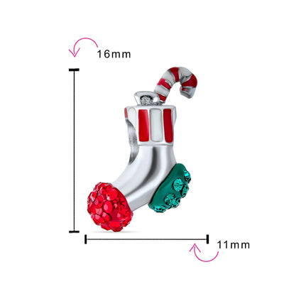 - Enhance your holiday bracelet with this charming Christmas stocking bead. Vibrant red and green crystals with enamel candy cane. Crafted from high-quality .925 Sterling Silver, adorned with sparkling pave crystal accents. Perfect for adding festive shimmer to your charm bracelet. Treat yourself or a loved one to this delightful holiday charm. Upgrade your collection with this must-have Christmas stocking bead today.