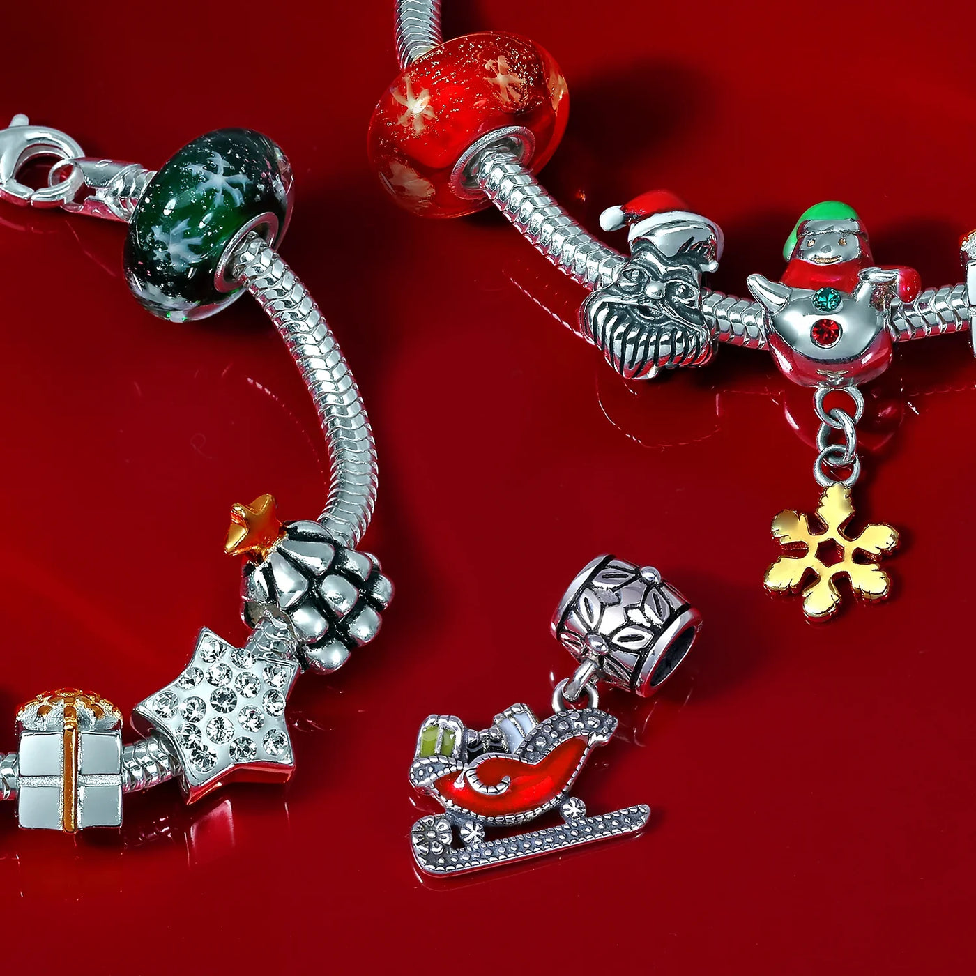 - Embrace the holiday spirit with our charming sleigh charm. Crafted from high-quality sterling silver, it features a stunning red enamel Santa's sleigh. Adorned with gifts, it dAngles from a flower motif bead. Perfect for any bracelet or necklace, this festive charm is a must-have for your holiday collection.