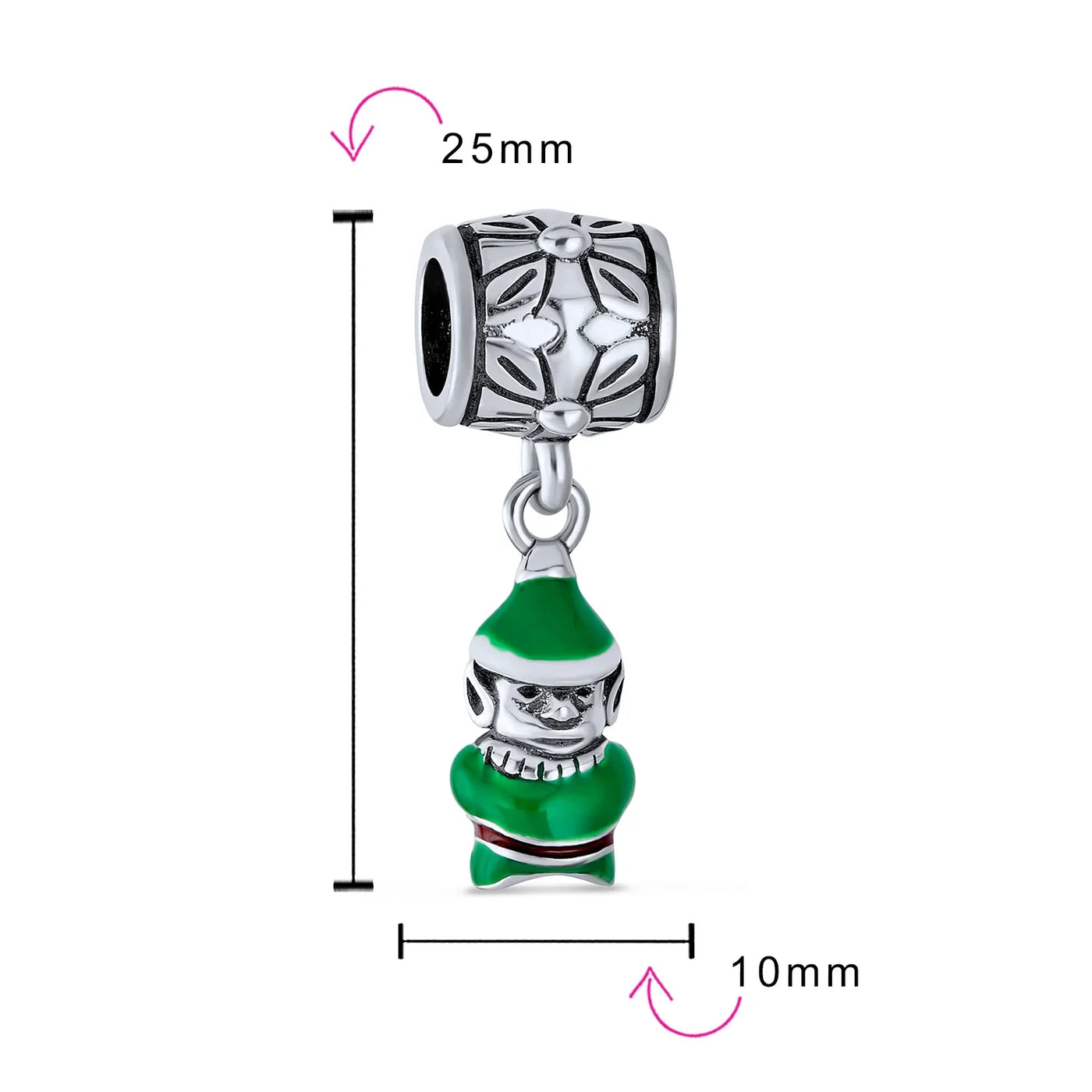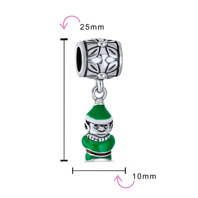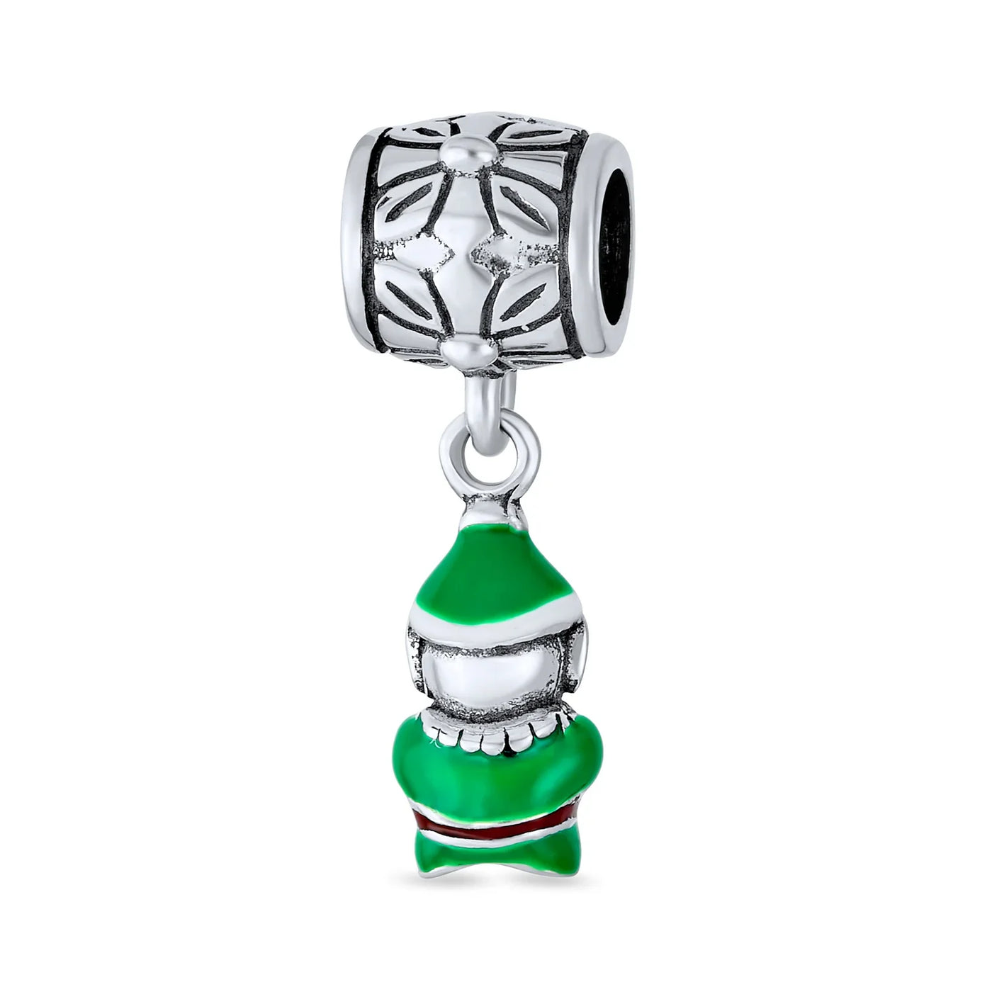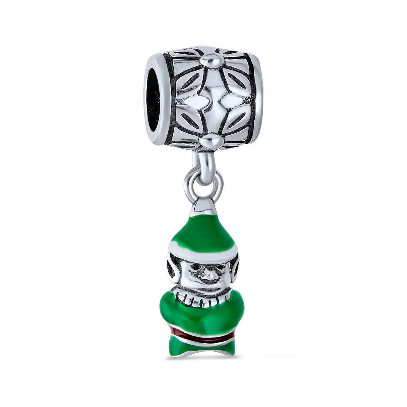 - Enhance your Santa charm with this adorable green and red elf. No Christmas is complete without Santa's little helpers. This sterling silver dangle elf charm is the perfect addition. Intricate details include a green enamel hat, red belt, and cute pointed ears. The charm dAngles from a sterling silver bead with a flower motif. Add a unique touch to your jewelry collection. Perfect for bracelets or necklaces, it complements Christmas-themed accessories. Great gift for yourself or a loved one. Add holiday charm to any jewelry piece.