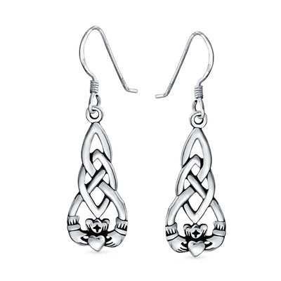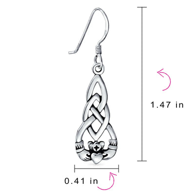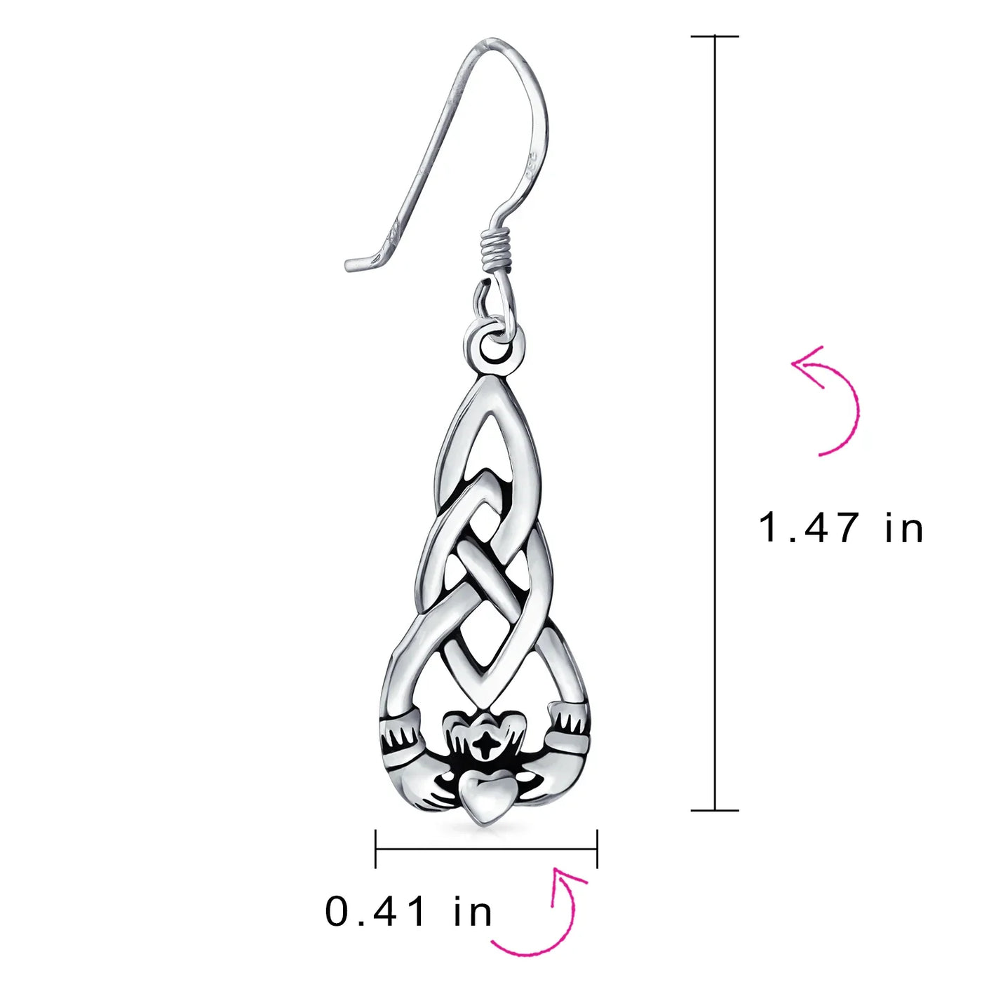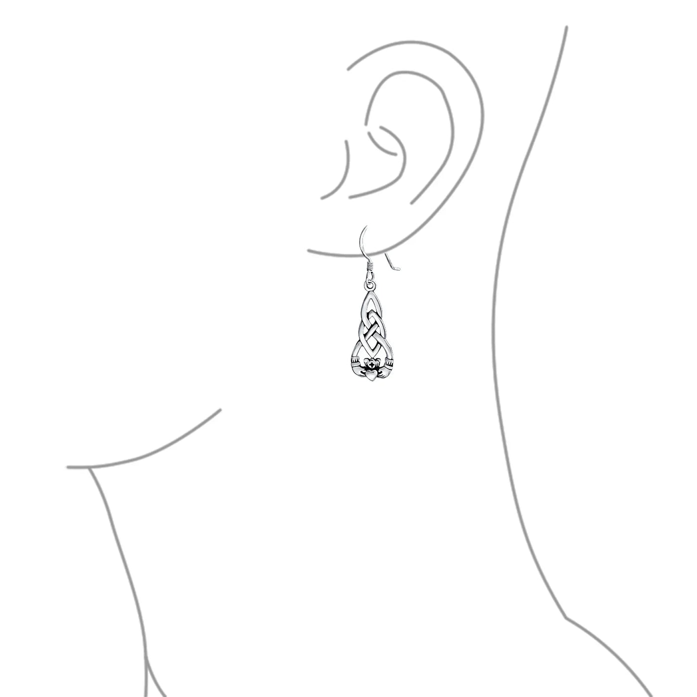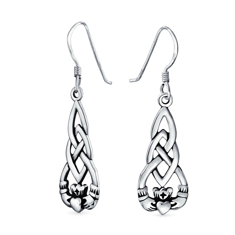 - Introducing our exquisite 925 Silver Celtic Knot Claddagh dangle earrings, embodying Irish tradition and spirit. These stunning silver earrings feature the timeless Claddagh design, symbolizing love, friendship, and loyalty. Crafted with precision, these Claddagh earrings exude elegance and charm. The delicate dangle style adds sophistication, while the lightweight design ensures all-day comfort. Immerse yourself in the captivating allure of Claddagh jewelry, a symbol of enduring love. Perfect for yourself or as a meaningful gift, these earrings showcase your romantic side and impeccable taste. Indulge in the beauty of these meticulously crafted silver earrings, designed to stand the test of time. Embrace the rich heritage and symbolism of the Claddagh with these classic earrings, blending tradition and contemporary style. Don't miss owning these Claddagh earrings, a true embodiment of love, friendship, and loyalty. Ideal for any occasion, they make a thoughtful gift for friends and family, showcasing your appreciation. Experience the magic of the Claddagh and elevate your style with these exquisite dangle earrings. Order now and embrace the enchanting world of Irish tradition and symbolism.