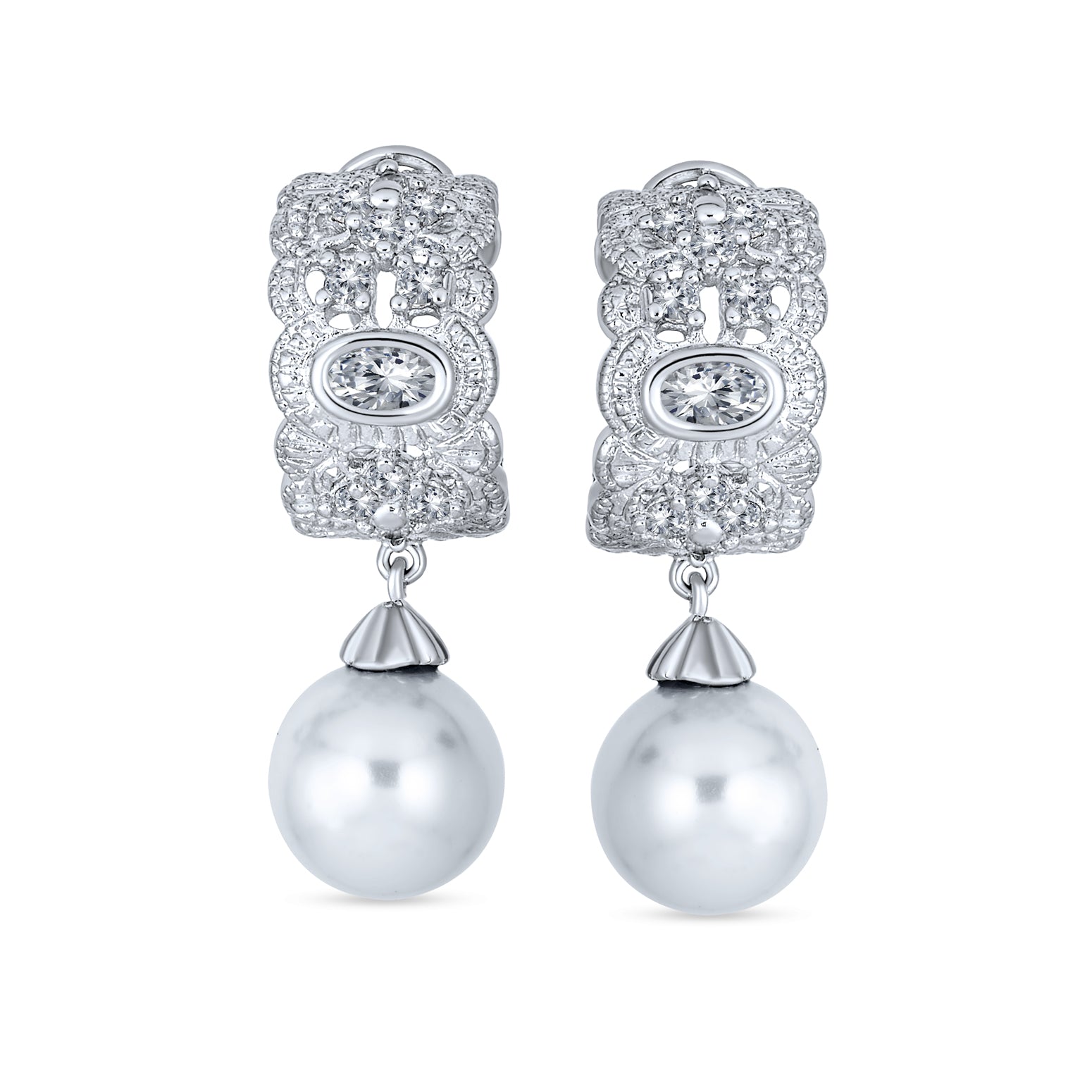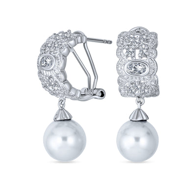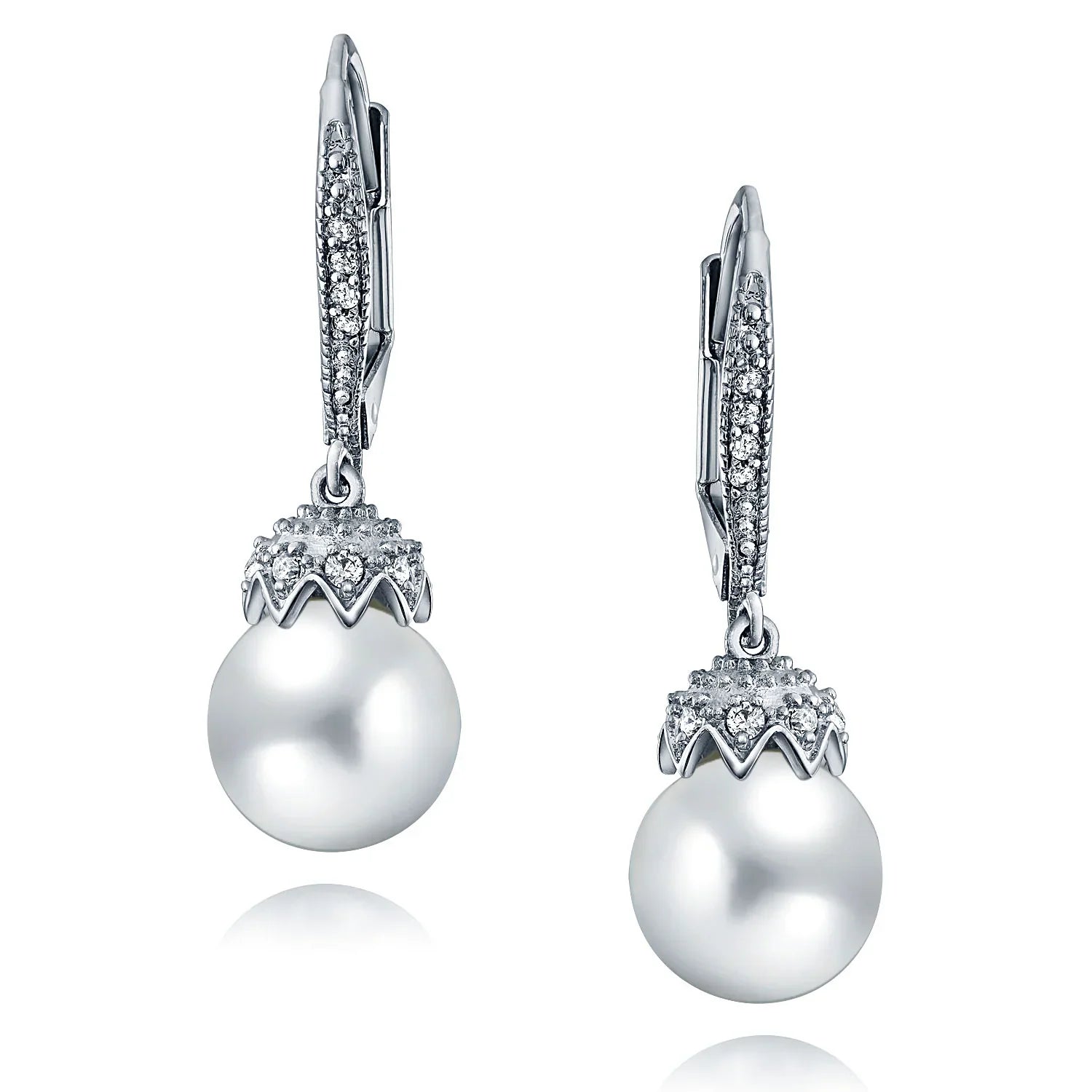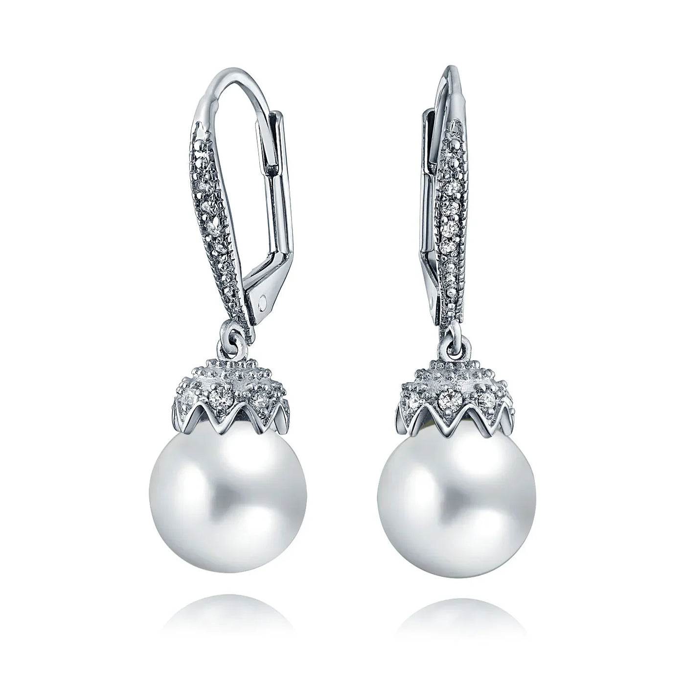 Modern Bridal CZ Round Ball Drop Ball Pearl Earrings Silver Plated - Bling Jewelry