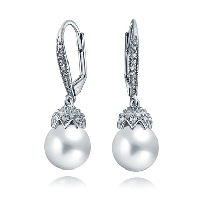 • Achieve a modern chic look with these lever back drop earrings. Stylish white Simulated Pearl lever back earrings are perfect for formal occasions. Featuring a modern design lever back with clear CZ and white Simulated Pearl drop. Ideal gift for June birthdays, these Simulated Pearl clip ons are a great choice. Get that chic Hollywood style with these Simulated Pearl lever back earrings. Timeless and elegant, these lever back Simulated Pearl earrings are a must-have. Purchase yours today!