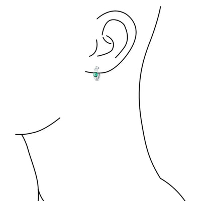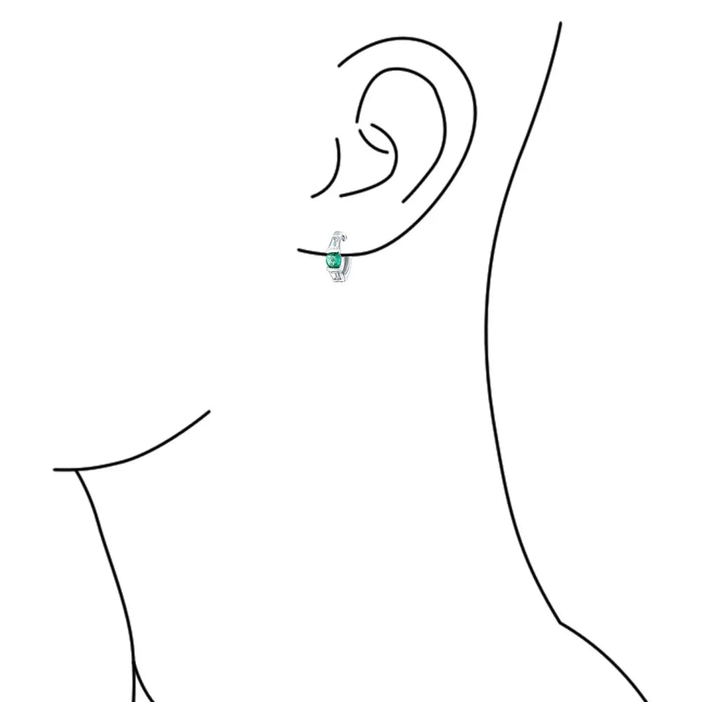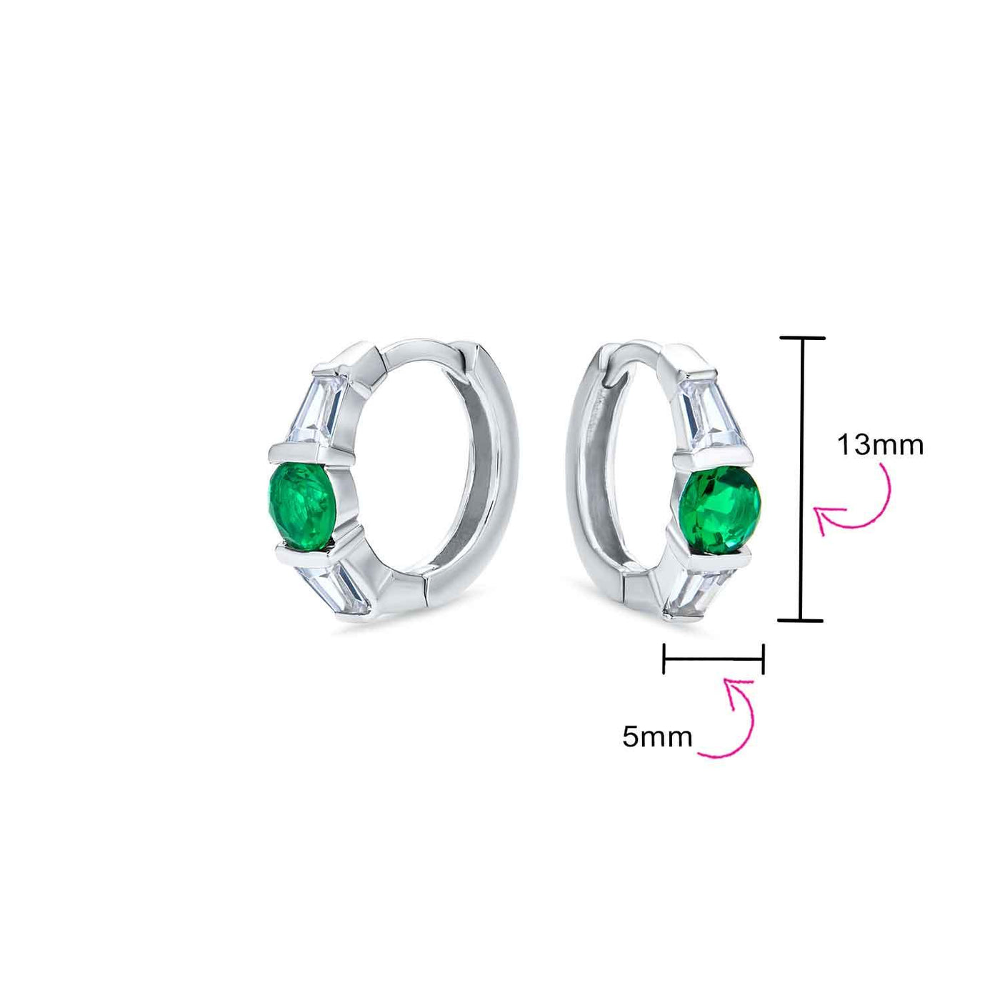 - May fashionistas, rock your birth month color in style with these arrestingly lovely, sterling silver, small hinged huggie hoop earrings. Highlighted by a vivid, round simulated emerald cz at center surrounded by glistening baguette czs on either side. For Pierced Ears Only, Hinge With Notched Post