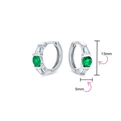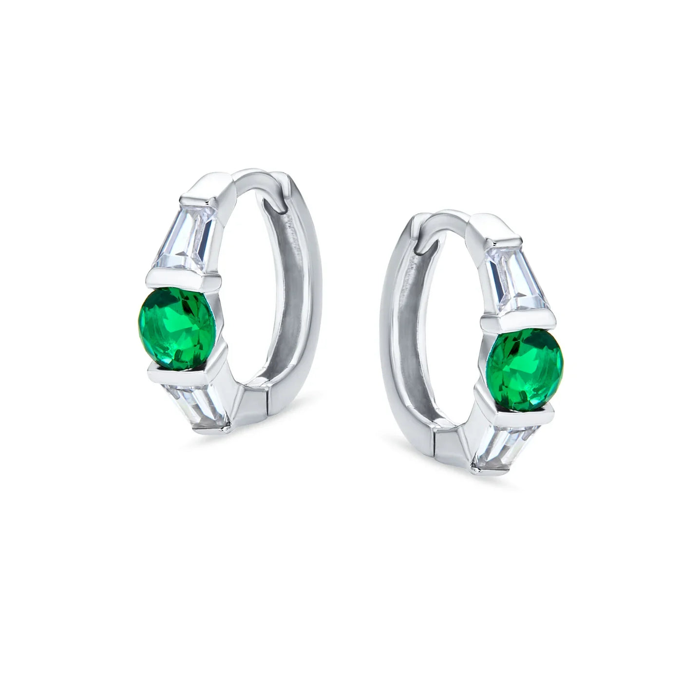 - Our sterling silver May birthstone earrings feature a feminine style you'll love. Sparkly Simulated Emerald green CZs are the focal point. Clear cubic zirconia baguettes add the perfect accent. Crafted in 925 sterling silver and rhodium plated to resist tarnish. These green huggie hoops add a pop of color to your style. Perfect for day or night, they offer a hint of glam. Easy to open and secure, they fit snugly on your ears. Small and dainty, ideal for women of all ages. Order your pair today!