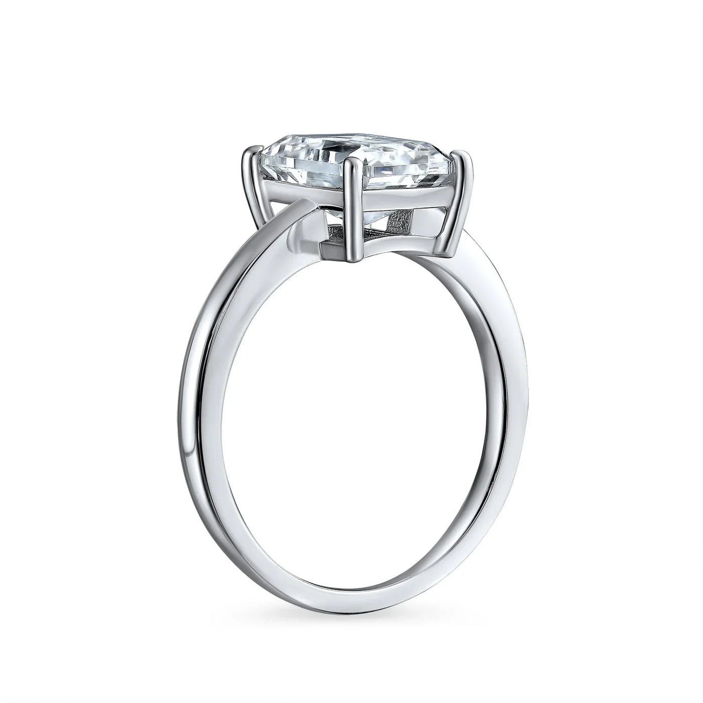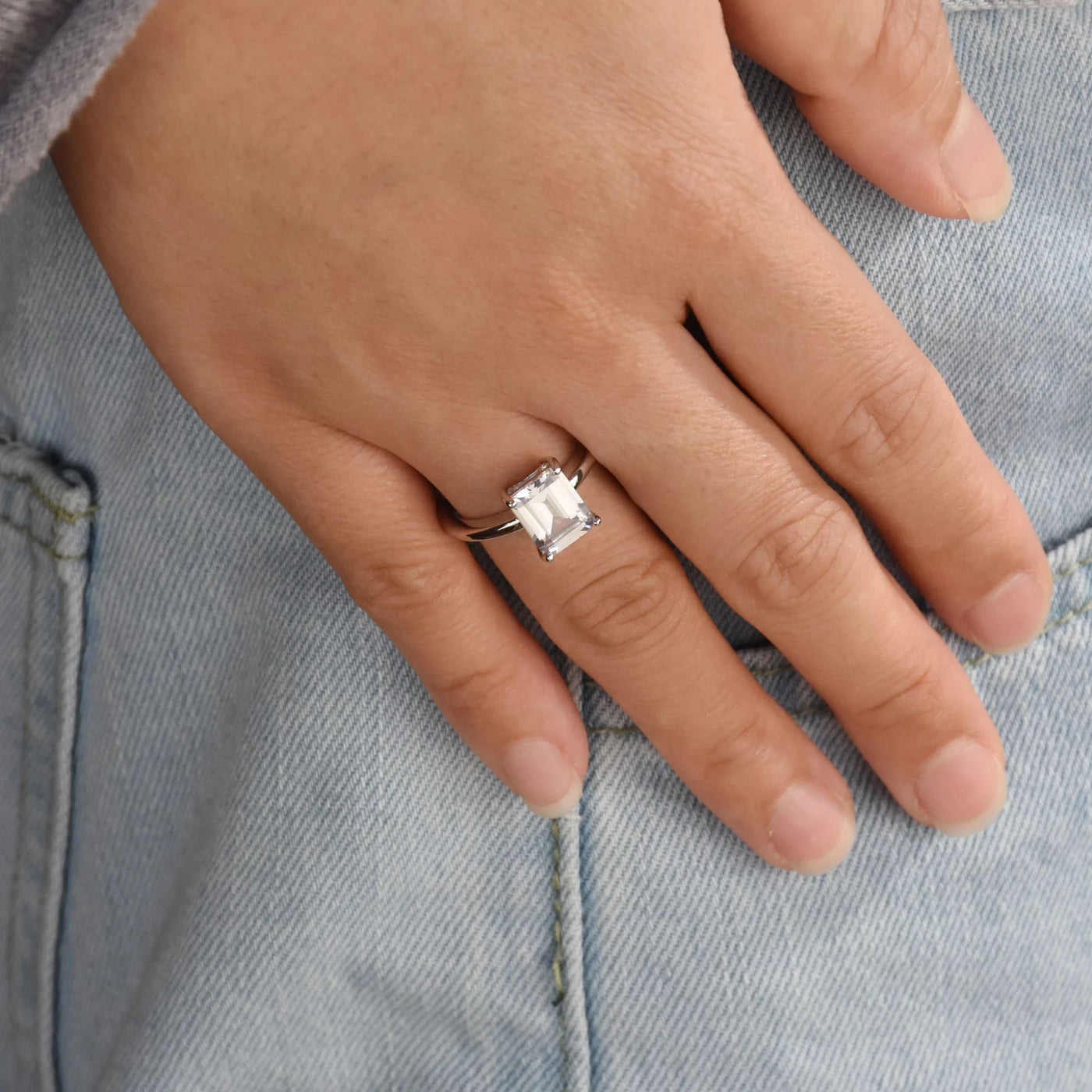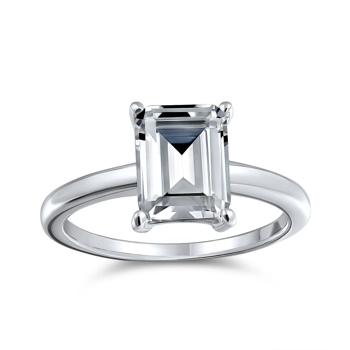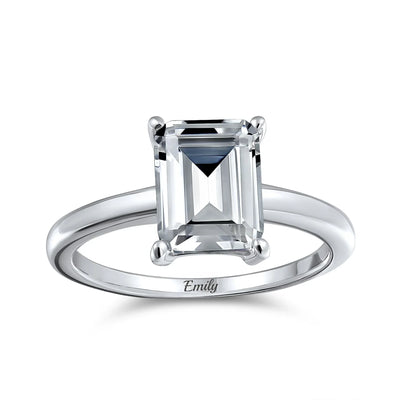 - As you drop to one knee, palms sweating with anticipation, present her with this stunning Simulated Emerald cubic zirconia ring. Cue the happy tears; she will be mesmerized by this glistening 1 carat solitaire stone. This prong-set cz rests atop a .925 sterling silver band, crafted with quality. This traditional solitaire Emerald Cut engagement ring is perfect for your real-life fairytale. Make your bride feel like the most special woman in the world with this perfect piece.